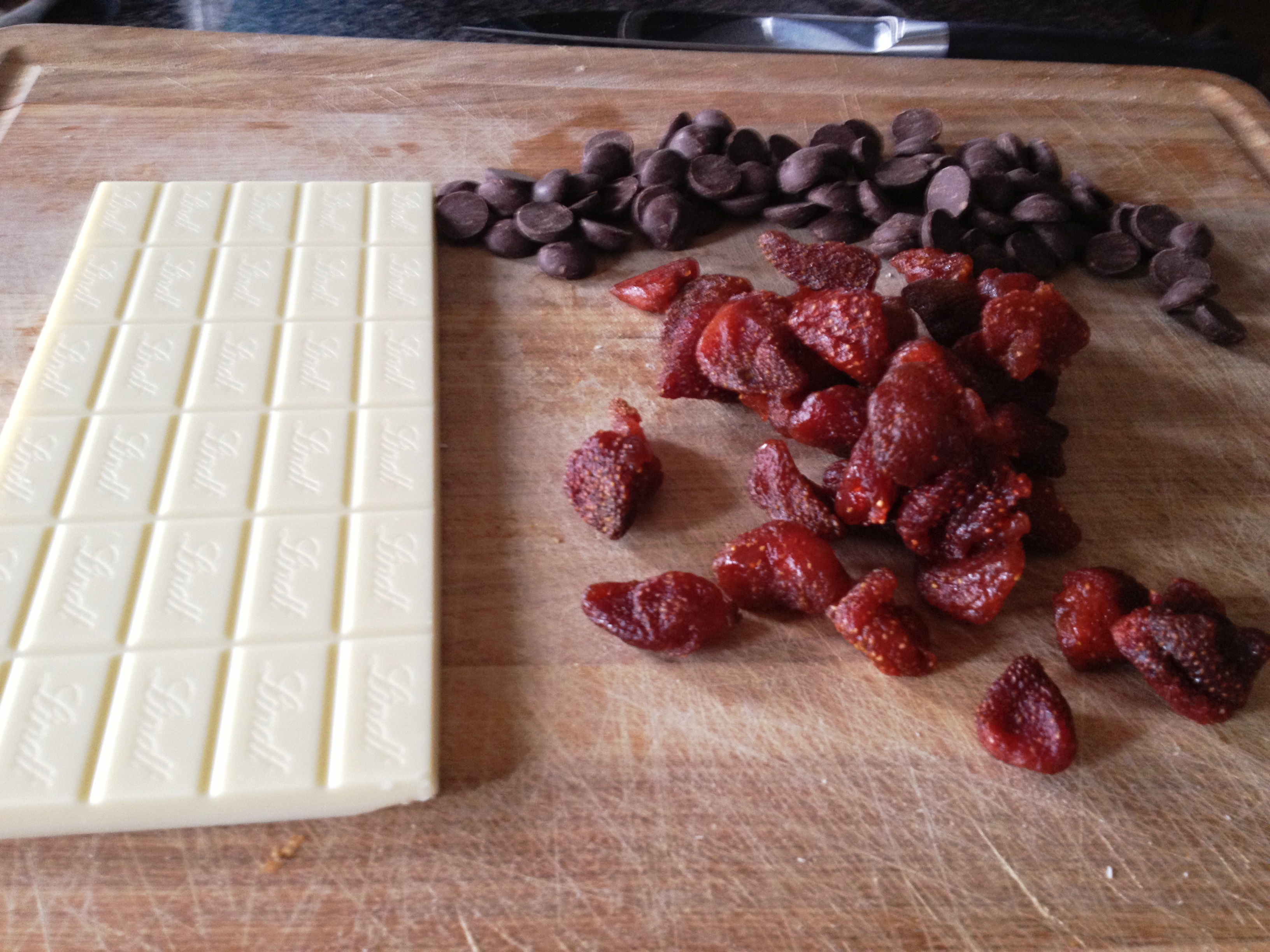 *These are not those dehydrated strawberries you sometimes see… these are more gummy-like… you can get them at Target. You could also sub dried cherries (chocolate covered cherry- can’t be mad about that).