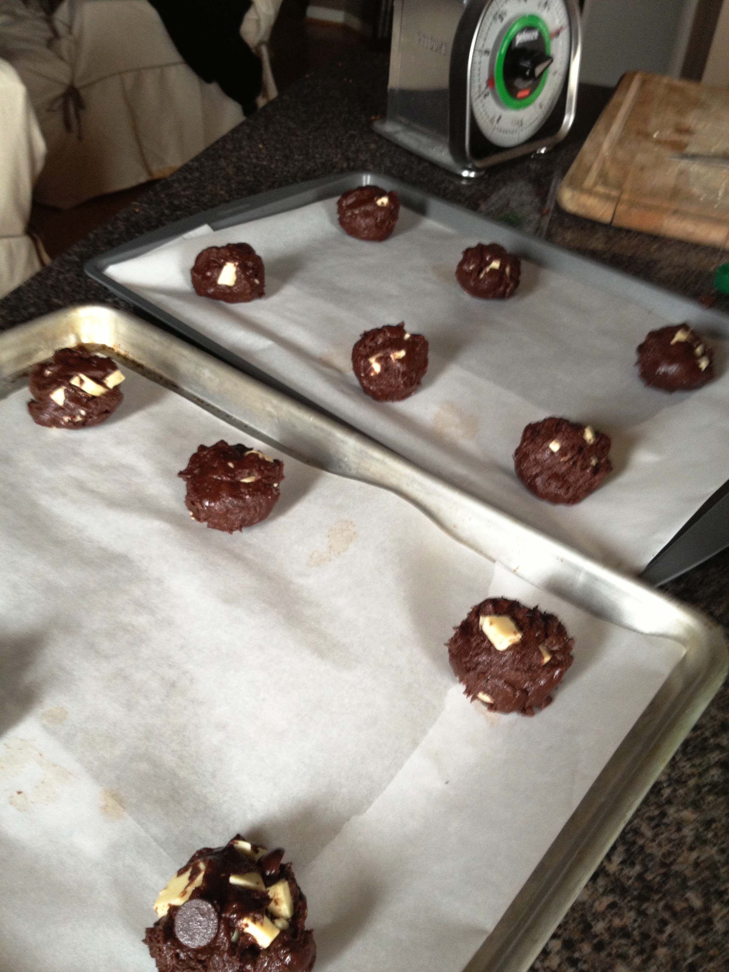 5. Drop 2 ounce balls of dough onto parchment lined cookiesheet. I used a scale but really whatever size you want works. This will be a messy experience.
