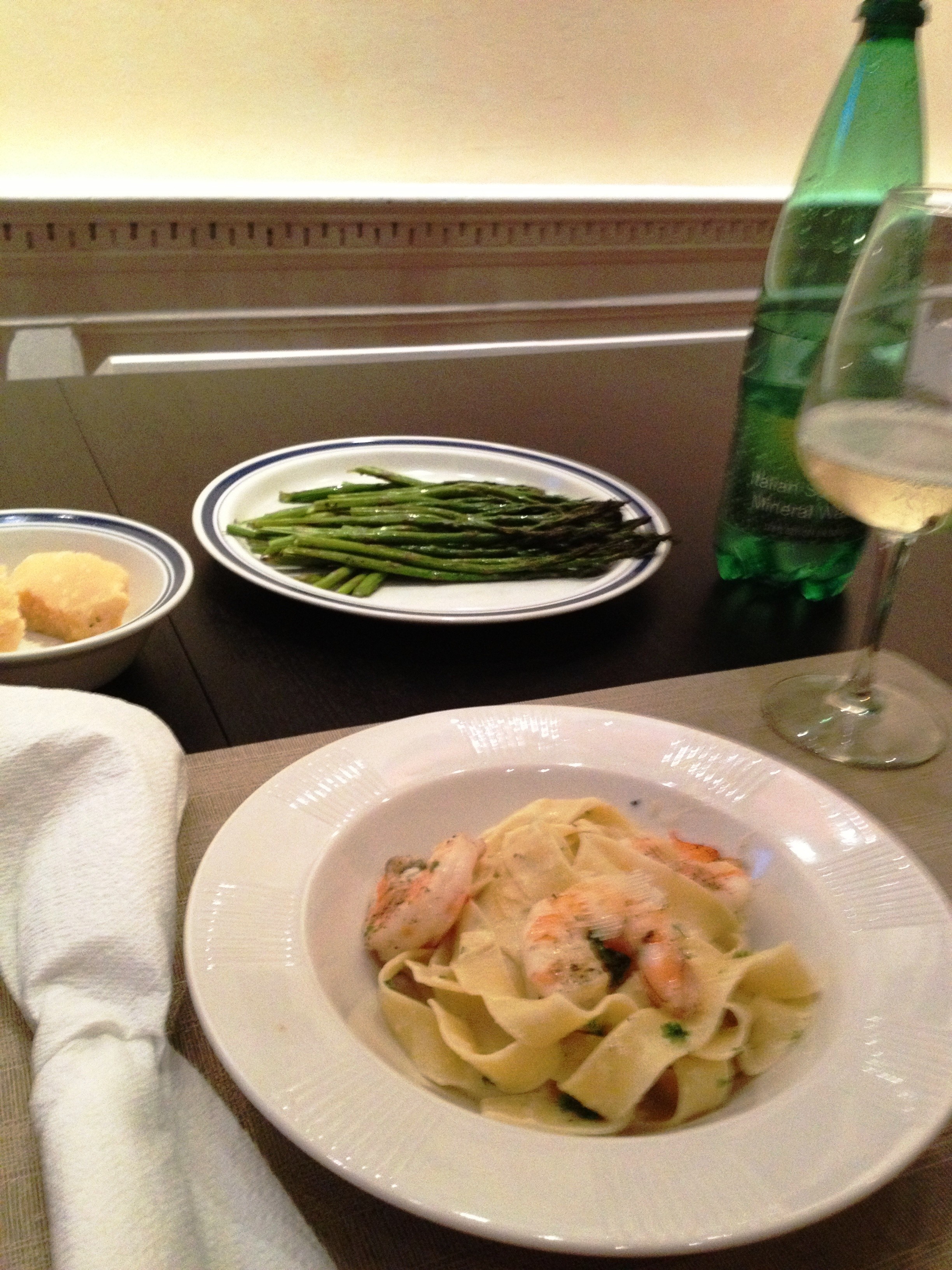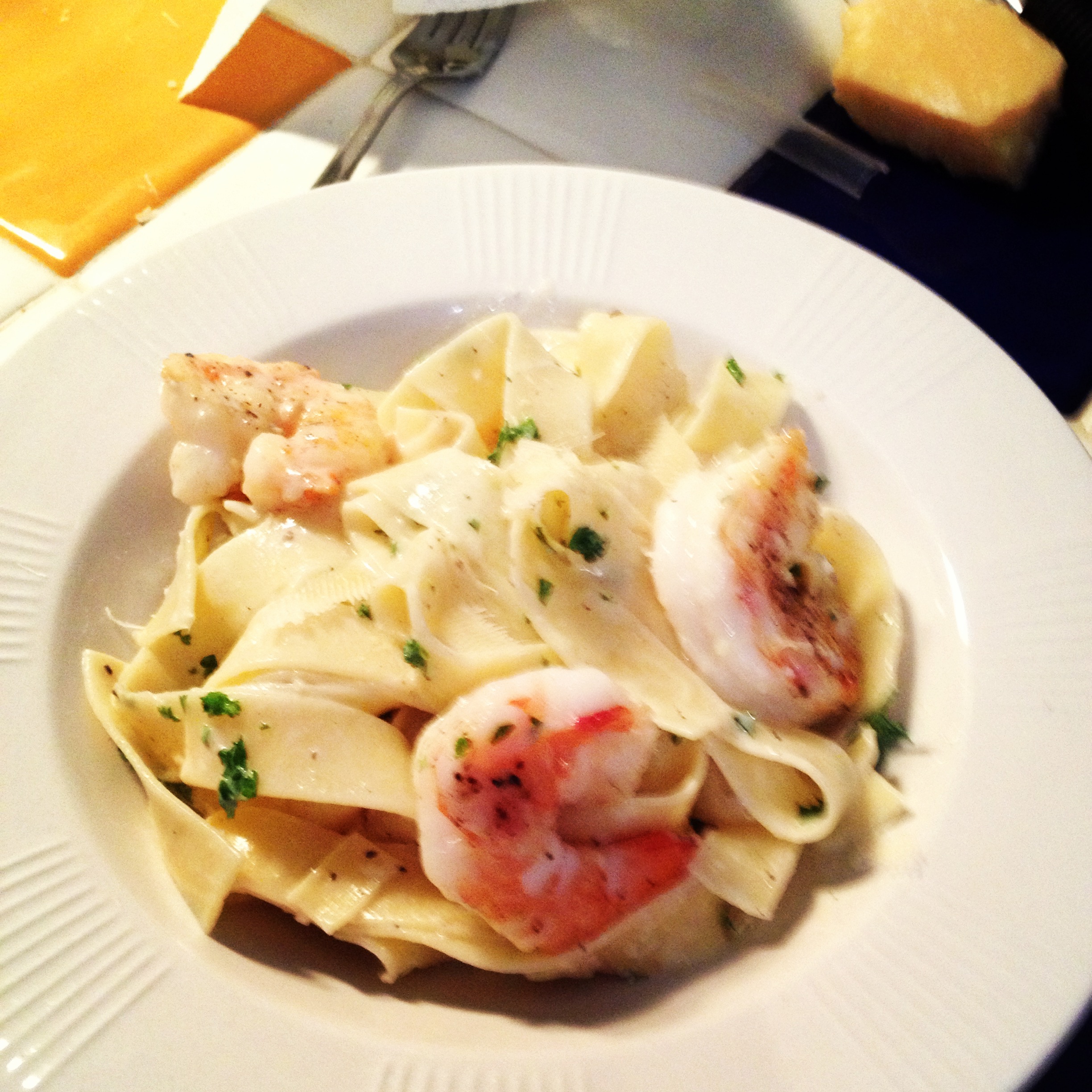 Boil a large pot of salted water. In a large sauté pan heat the half and half (really cutting calories by not using the heavy cream in this dish…oh wait) over medium heat. Reduce the heat to low and add the butter/salt/pep and stir occasionally until the butter is melted. Heat olive oil in separate sauté pan over high heat. Salt/pep the shrimp and sauté in oil until pink/cooked (roughly three minutes Cook the pasta until al dente (it will cook a little more in the sauce) and add to the cream mixture (reserve 0.5 cups of pasta water if you feel it needs to be thinned out- I added 0.25 cups of pasta liquid to the sauce…let the sauce and pasta hang out over low heat for a bit so they become friends). Add parmesan and parsley.