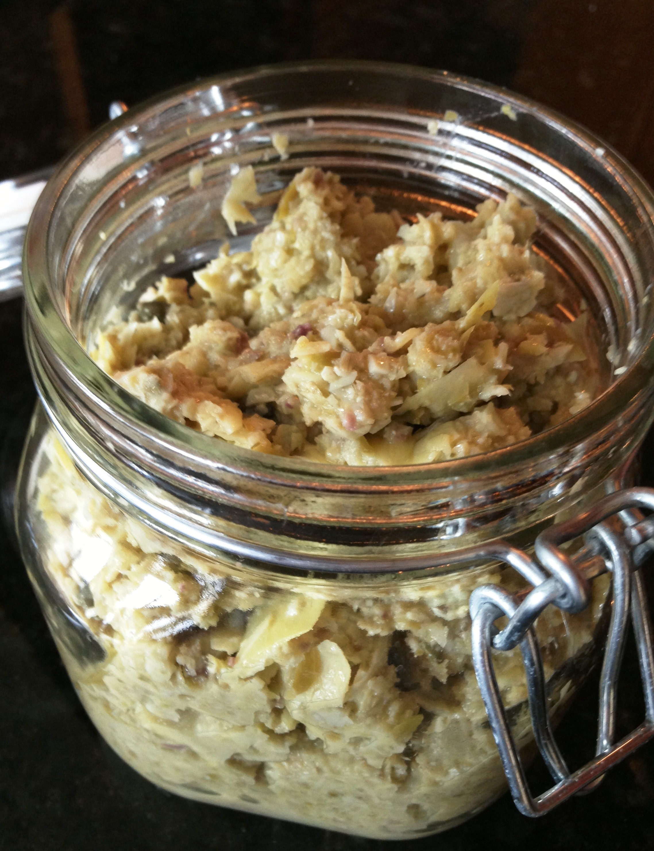 Combine in a food processor 1 garlic clove (peeled- do I really have to specify that?), 1 cup of large green pitted olives, 1 tablespoons capers (rinsed and drained), 1 15 ounce can of artichoke hearts (drained) and 0.25 cups of extra virgin olive oil.