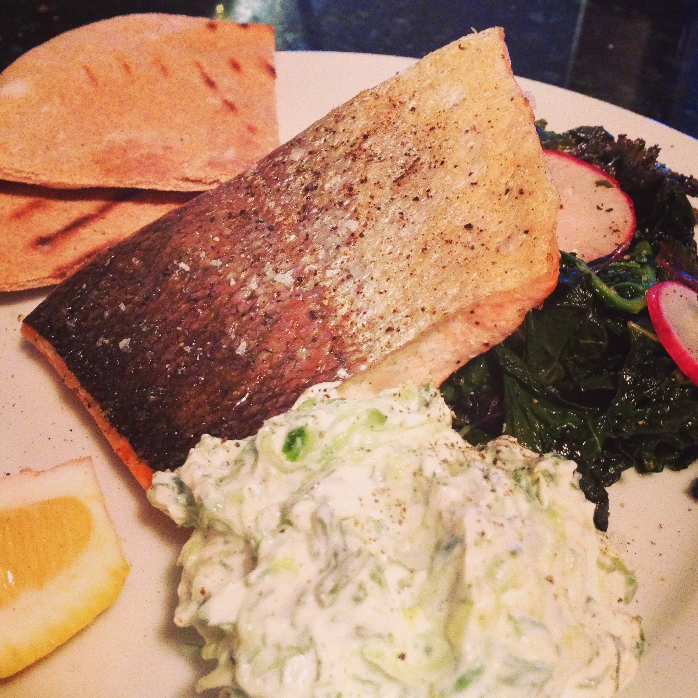 Grab two salmon filets. Season with salt/pep and rub the skin with of each with 1.5 tablespoon of room temp butter. Heat two tablespoons of olive oil in sauté pan over medium high heat like you mean it. Add salmon to the pan skin side down and cook for six minutes. You’ll want to flip before then… don’t. Flip after six minutes and let cook on the other side for one minute. Serve with tzatziki and sautéed kale with radishes or whatever your heart desires.