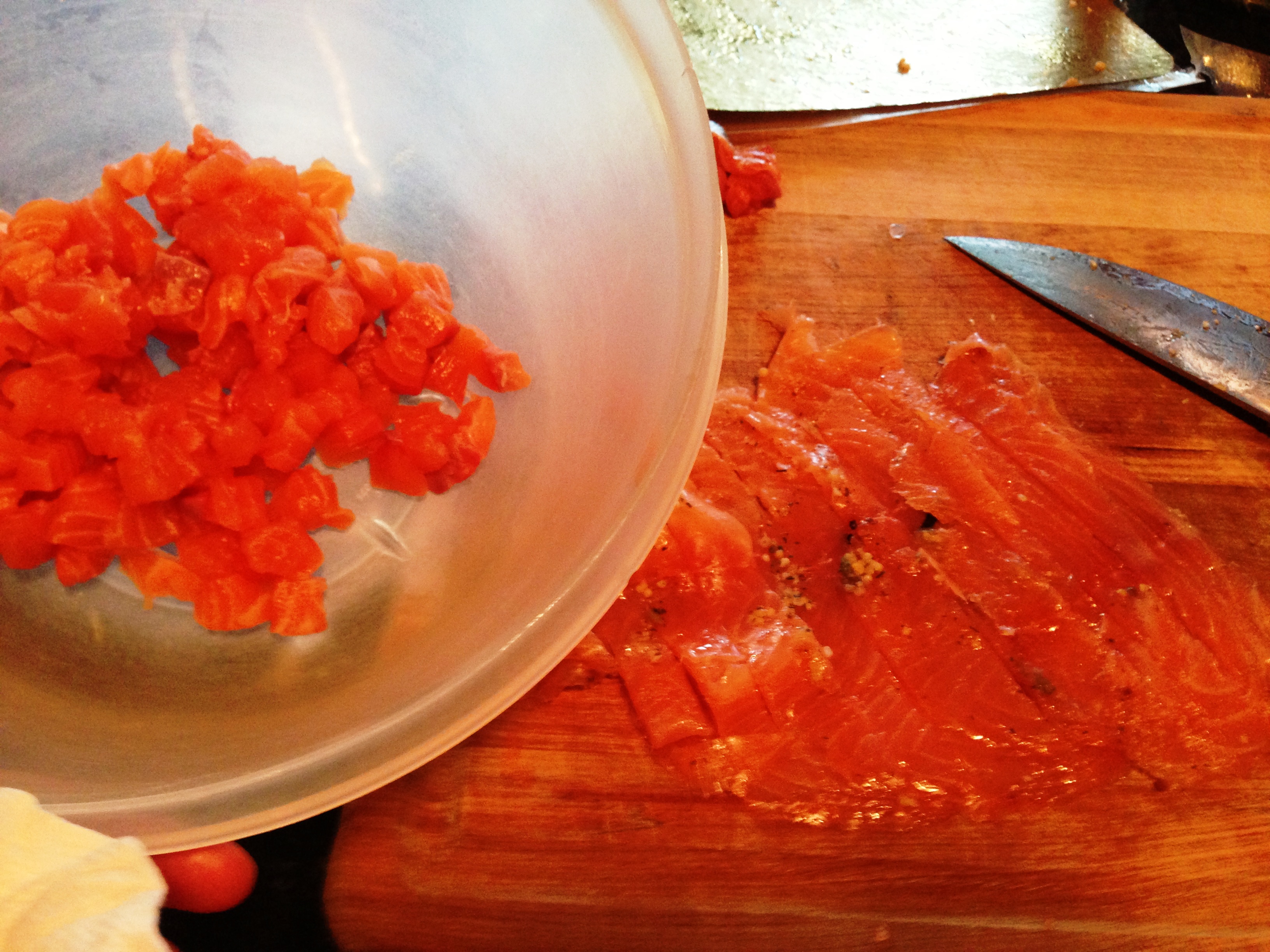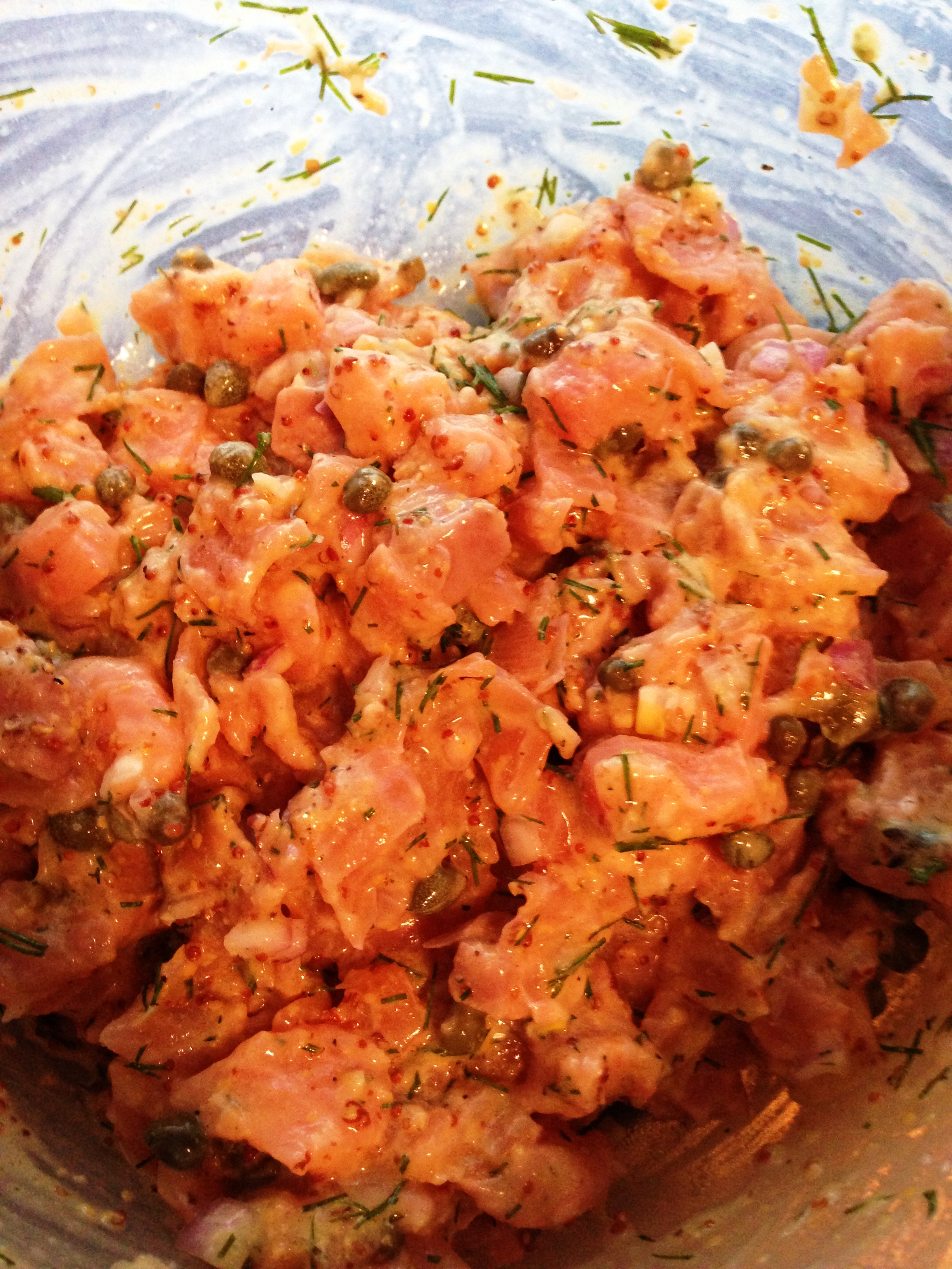 I’ve had some good tartare’s over the past few years. Recently I had one at Untitled with house smoked salmon roe, homemade crackers and soy aioli. My tartare is a little more humble but absolutely satiating and delicious. Some people in my life (cough cough mom) tweek out over raw fish. A- this recipe has a mix of smoked and fresh salmon so it cuts back a little on the “raw” fish. B- IT’S NOT RAW… just because the fish is cooked in acid v. heat doesn’t mean it’s not cooked. Can I get a little trust here?
