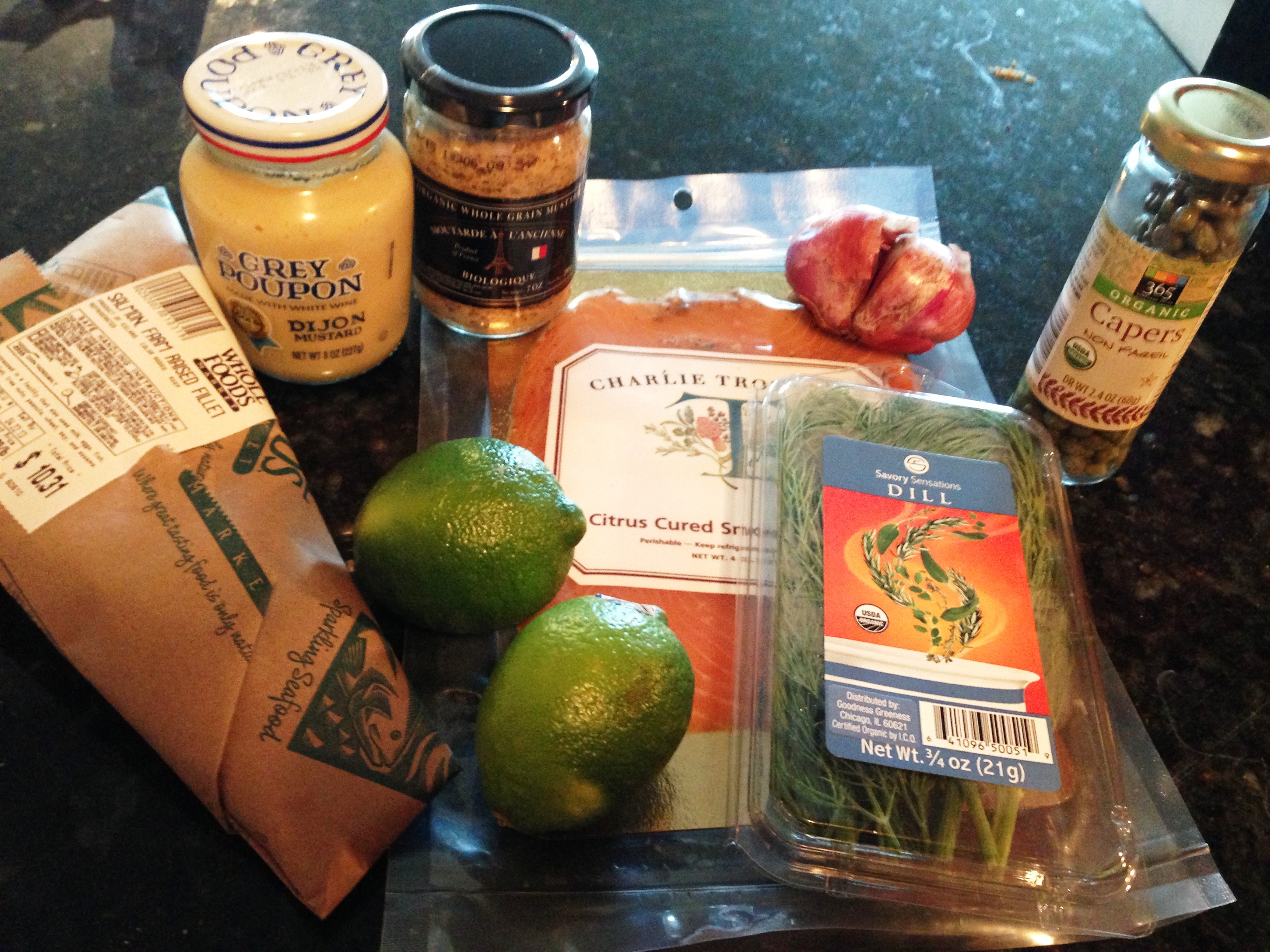 Cut the fresh salmon and the smoked salmon in 0.25 inch dice. Mix in a bowl with lime juice, shallot, oil, dill, caper, mustards, salt/pep. Cover with plastic wrap and let marinate in the fridge for a few hours.