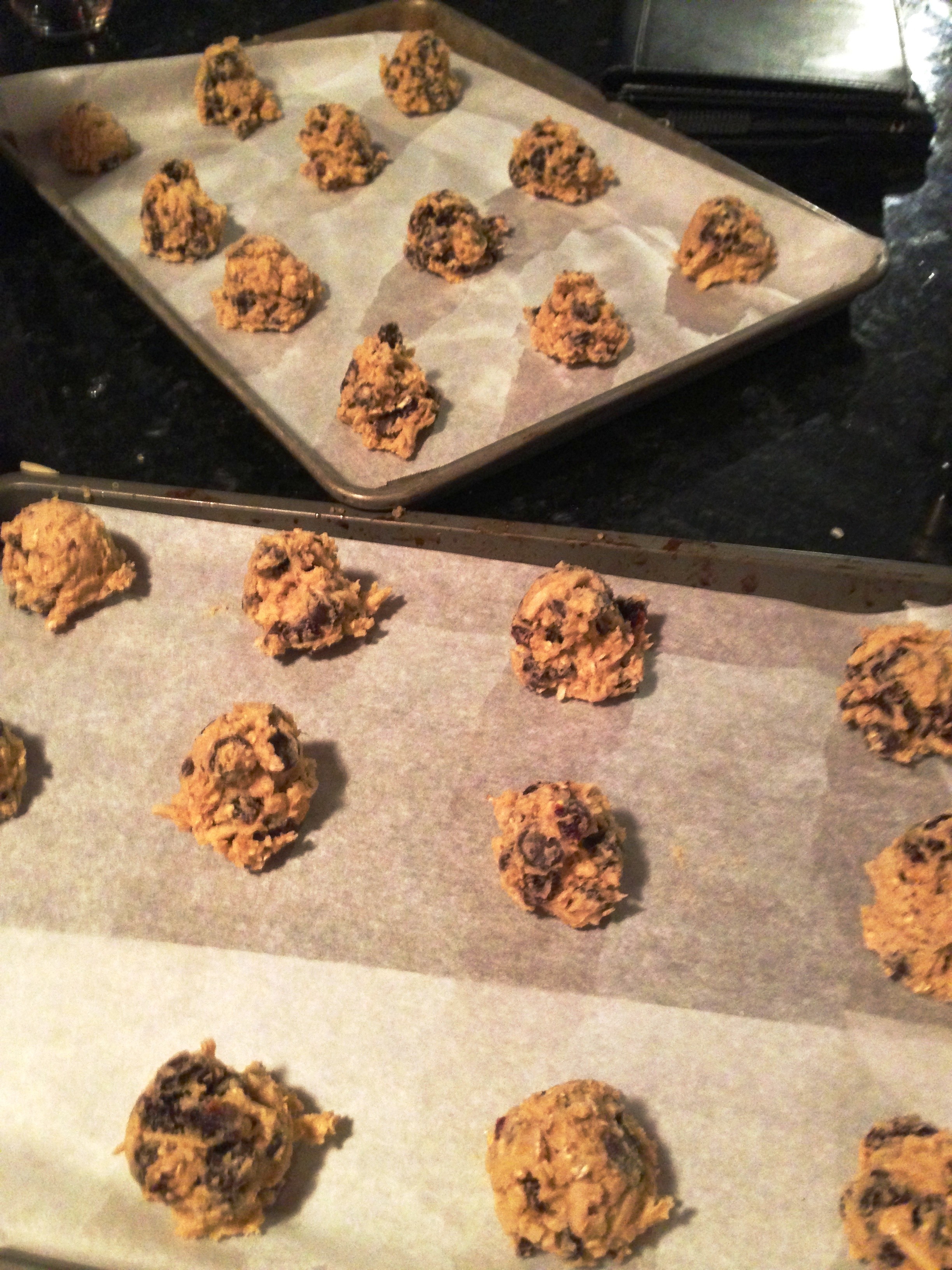 Drop dough onto two parchment paper lined baking sheets. Bake for 12 minutes at 325 (switch them half way through if they are on different racks which will they will be unless you have an industrial sized oven which means you are awesome).