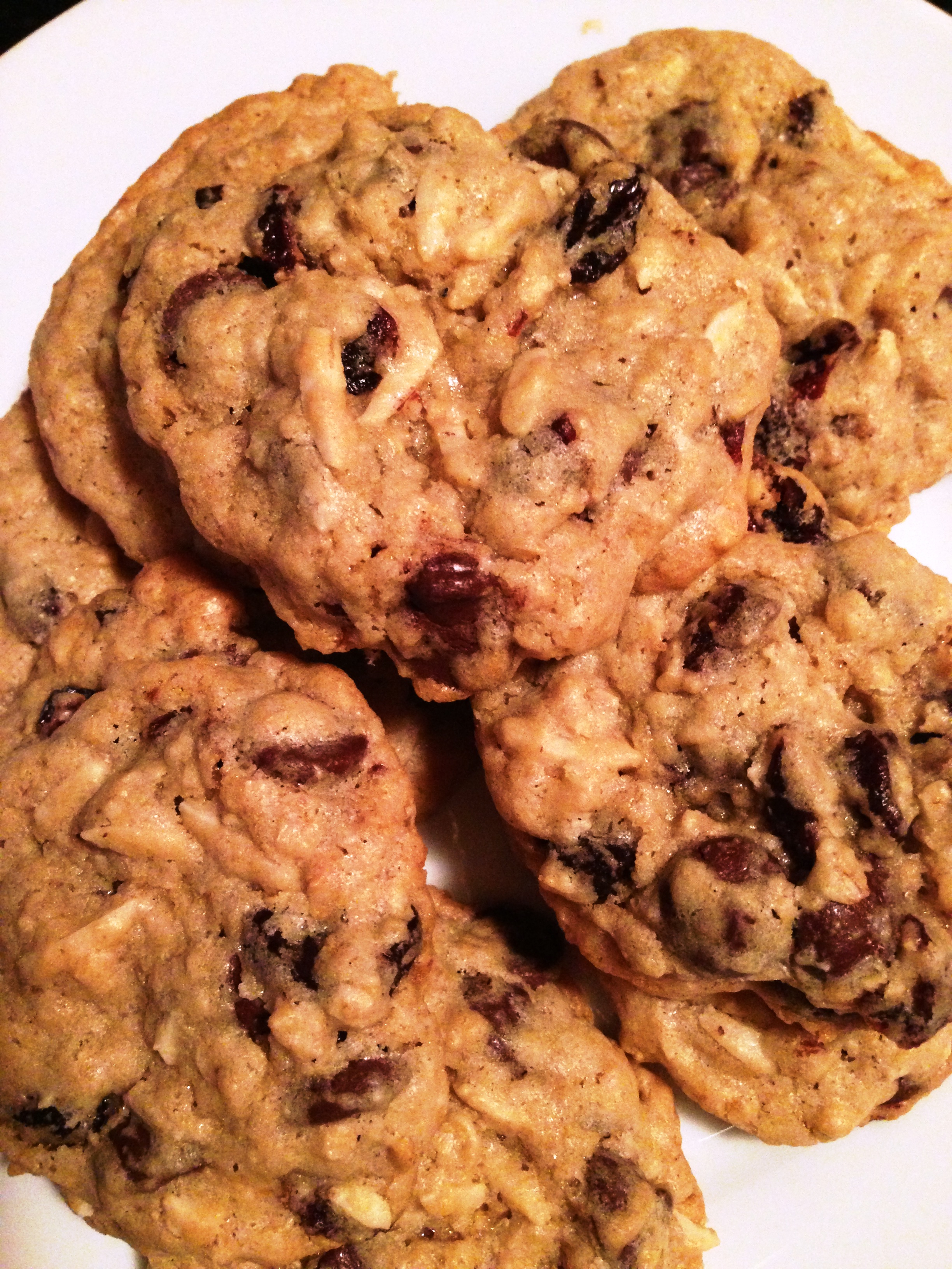 Remember when you’re growing up and start facing situations where you have to know your social security number? And every time you call your mom and ask her what it is? And you start to wonder what the deal is with this number and eventually give in to memorizing it? That is what this recipe is. Just tattoo it on your brain forever. It’s nothing fancy- I’m not asking you to buy a weird flour or special all natural sweetener here—these are just go to delicious cookies. And unlike your social security number- you can add or subtract from this oatmeal based cookie to create a number of treats. Today’s is Dark Chocolate Oatmeal Cherry and Almond.