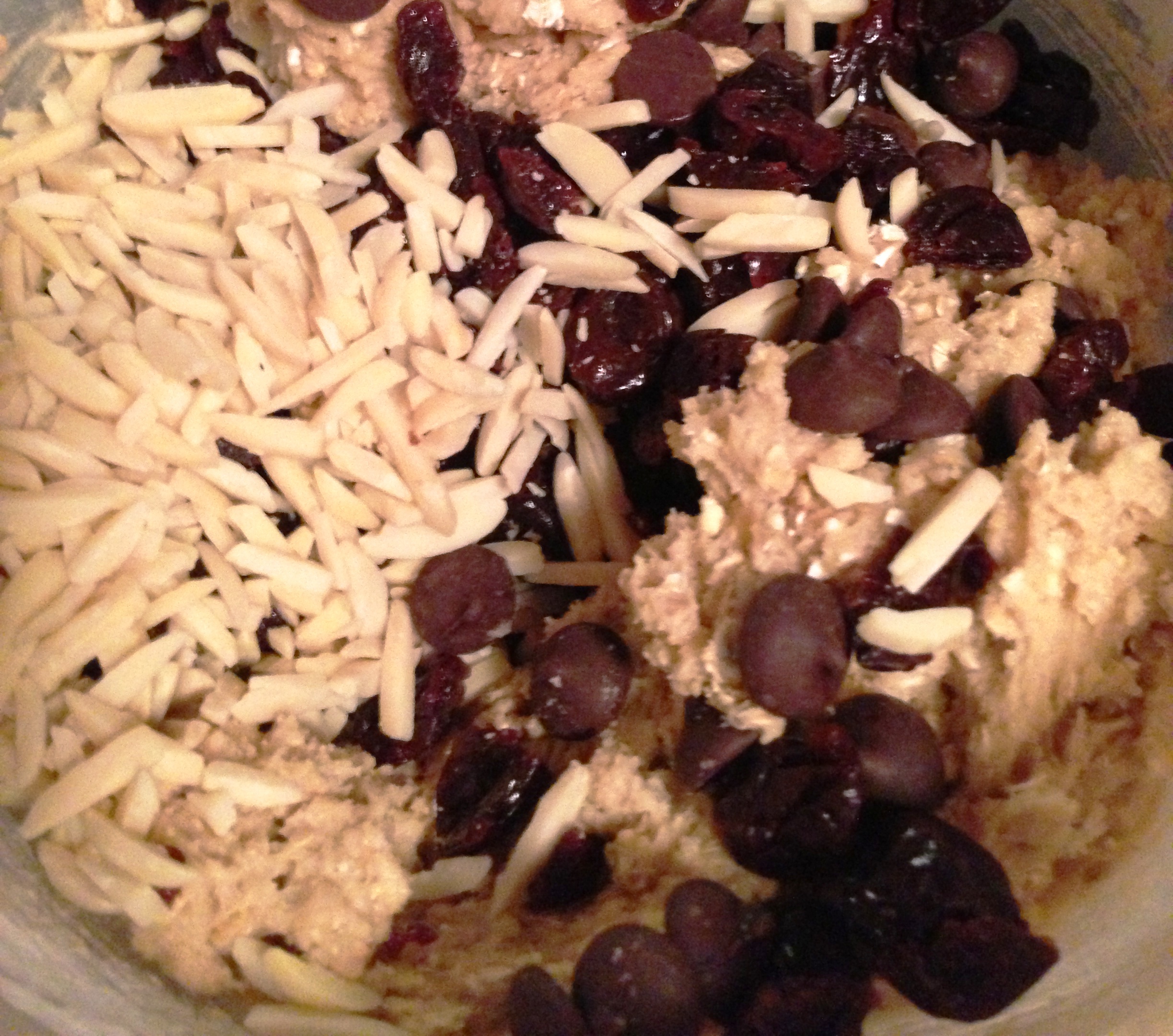 Add 1 cup of old fashioned oats and then 3 cups of whatever you want. I did 1.5 cups dark chocolate chips, 1 cups dried cherries (that I chopped up a bit) and 0.5 cup slivered almonds.