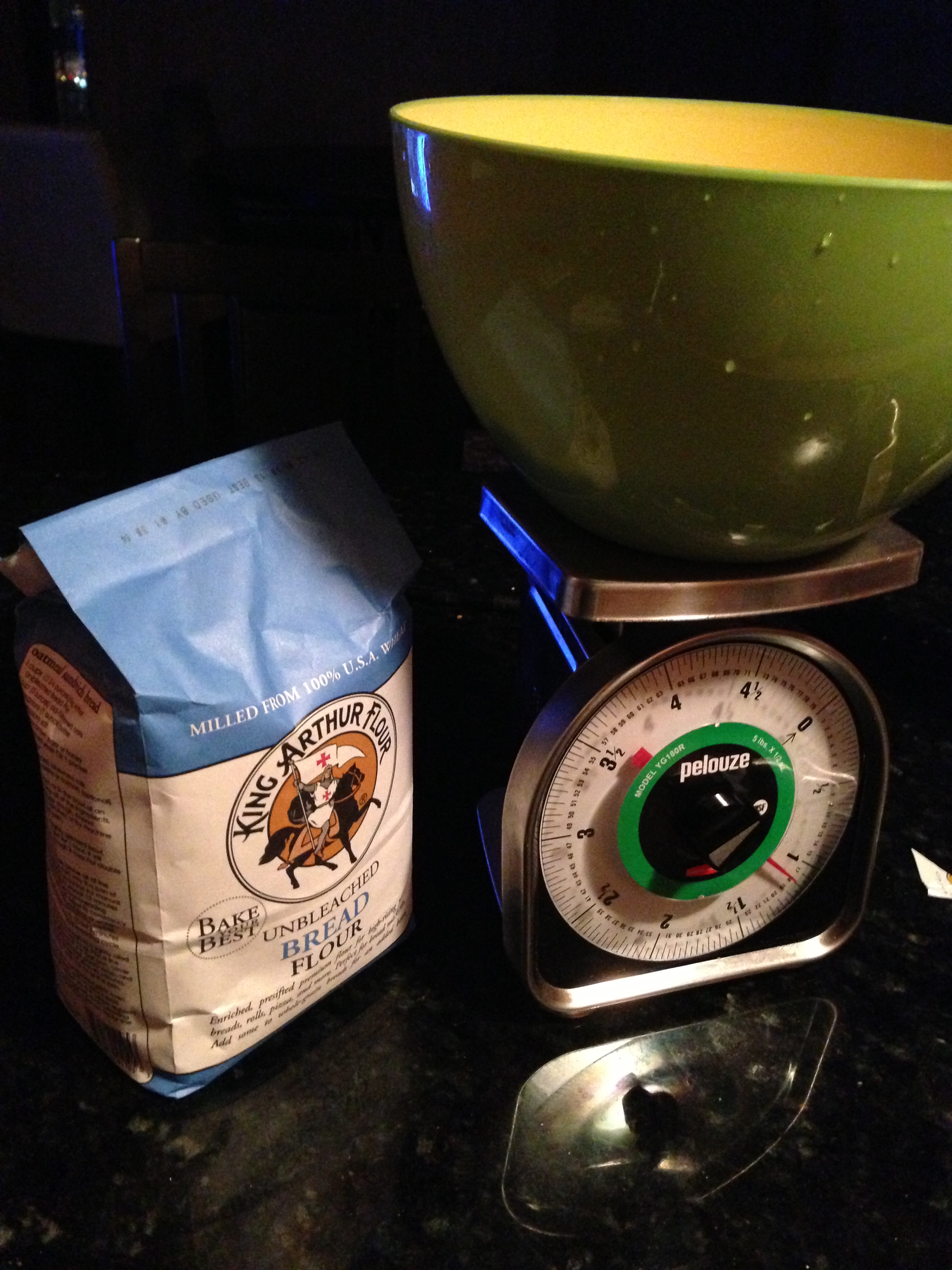 I came home Thursday night to a food-less apartment and knew I would not have the energy to head out Friday for sustenance. So I mixed together 17.5 ounces of bread flour, 0.25 teaspoons of active dry yeast, 2.5 teaspoons of salt and 12 ounces of filtered water, covered it with plastic wrap and went to bed.