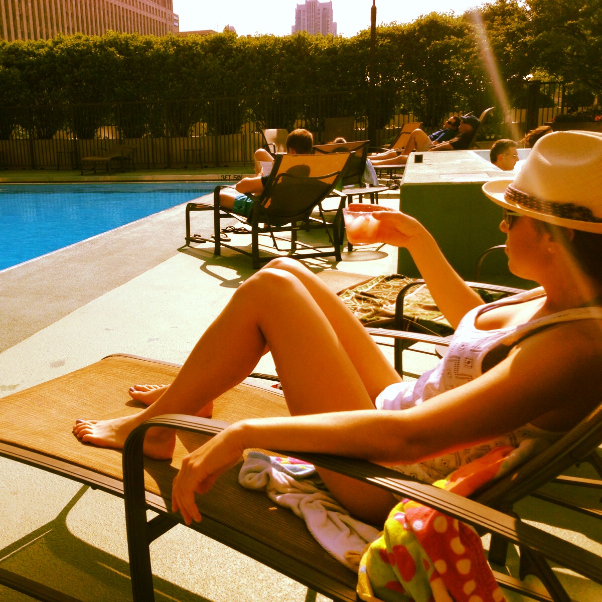 Last Sunday I got to actually go to my pool for the FIRST time since I moved in and let me tell you it was worth every overcharged bit of rent I spend to live here.  To be clear the entire day was pretty much perfect.  I got to have an amazing brunch at Lula Café with two of my favorite people, stop by the Logan Square Farmers Market and bop the rest of the day with my best friend Steve.  After an intense stop by the Pride Parade we knew what we needed: Sangria.