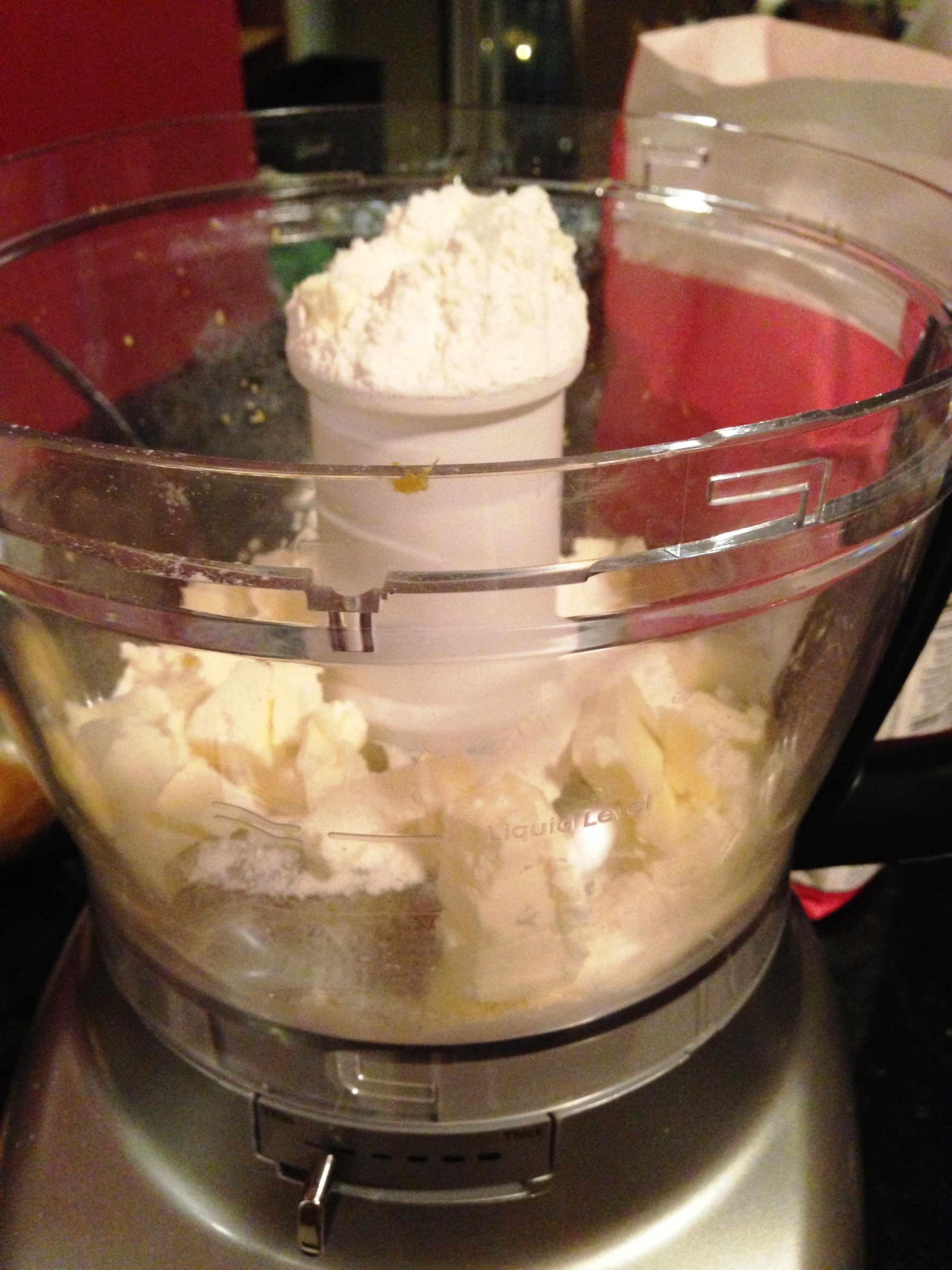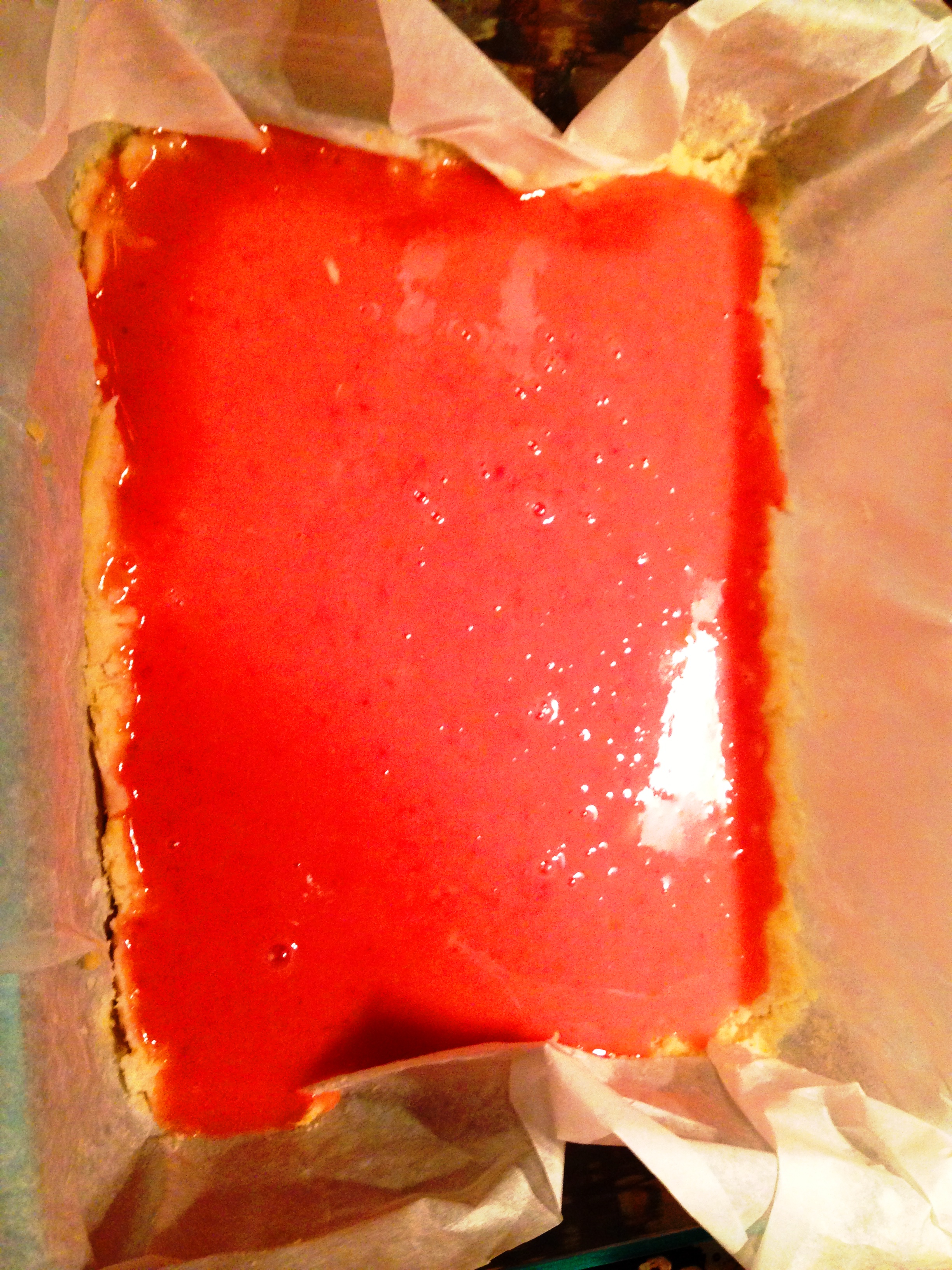 So, put all of the base ingredients in the food processor and pulse until it makes a crumbly mixture. Pour that into your parchment lined pan and use the back of a measuring cup to pat in. This won’t look great but really it’s just a vehicle for you to eat lemon heaven without having to put your paws directly on the pink goo part so don’t stress. You’ll want it about 0.5 inches up the sides and even on the bottom.