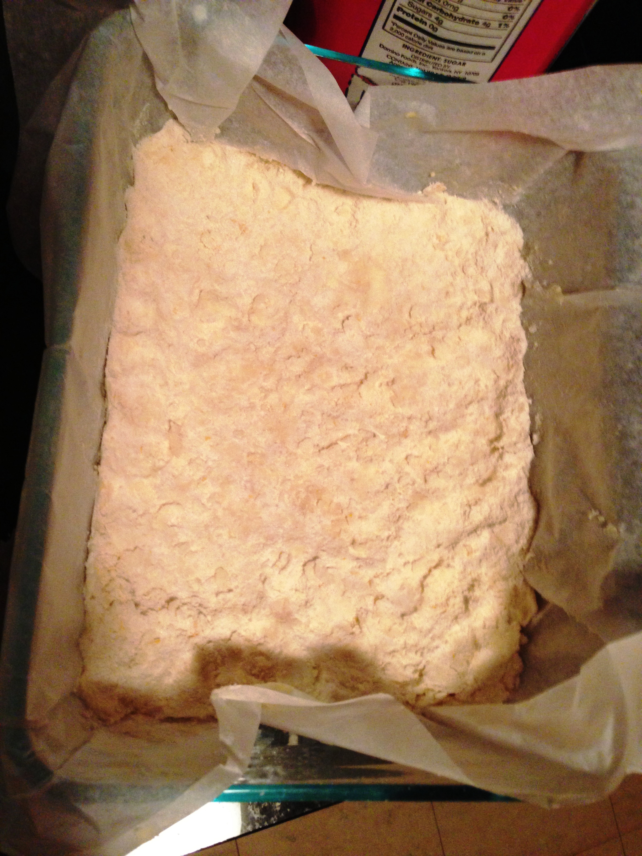 Line a baking pan with parchment paper and butter it (I used some weird 9.5×7.5 but 8X8 would be ideal). It’s awkward to smoosh this paper into the pan and butter, you just have to deal.