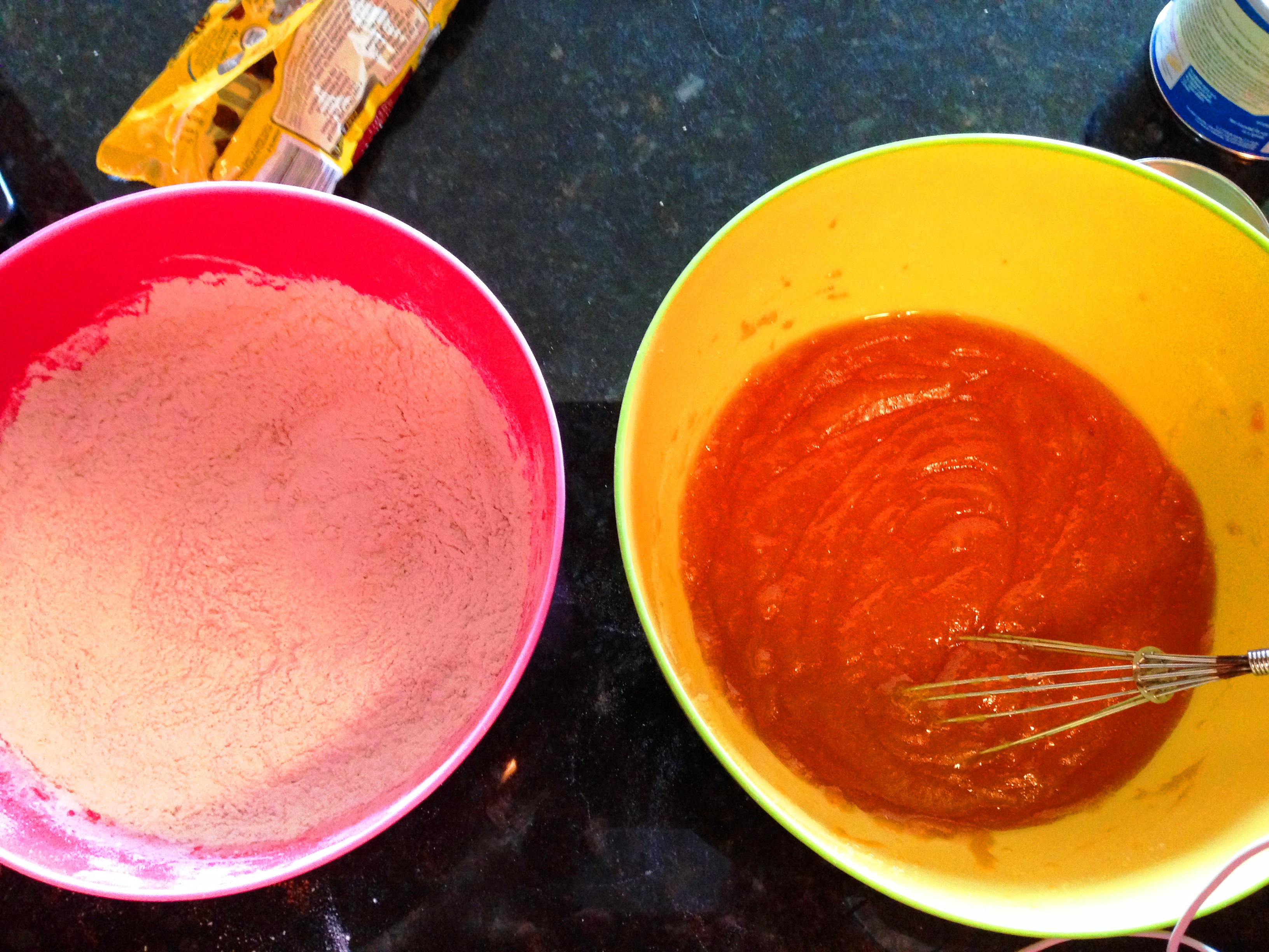 In another bowl, whisk together the pumpkin and oil. Add the sugar and whisk. Add the eggs one at a time. Add the vanilla. Add the water (this feels and looks weird) and whisk until combined. In a small bowl toss 1.5 cups of chocolate chips with the flour. Fold the floured chocolate chips into the batter using a spatula.