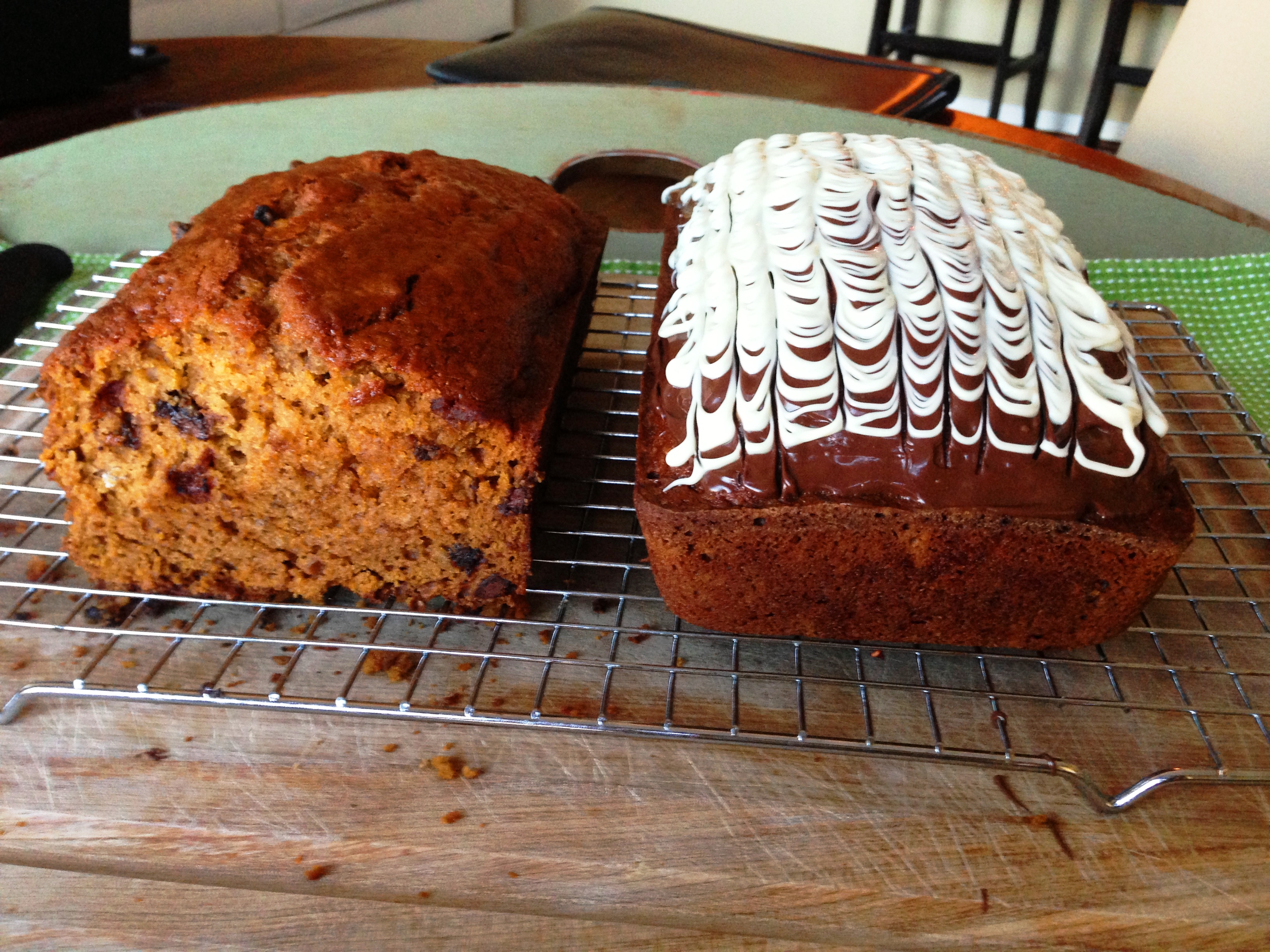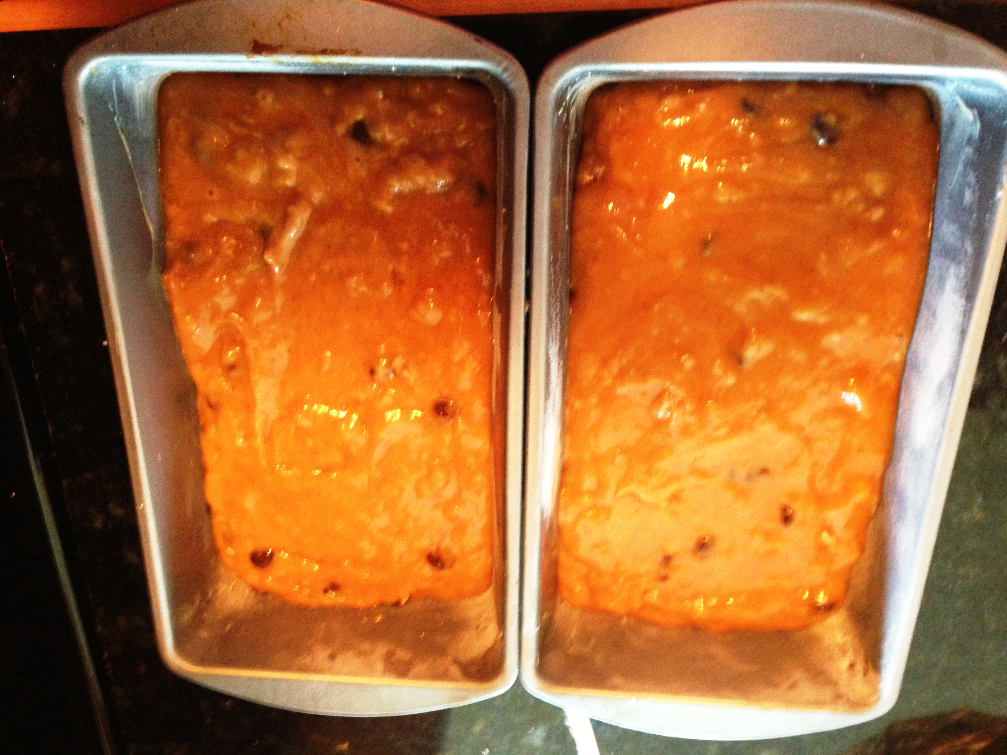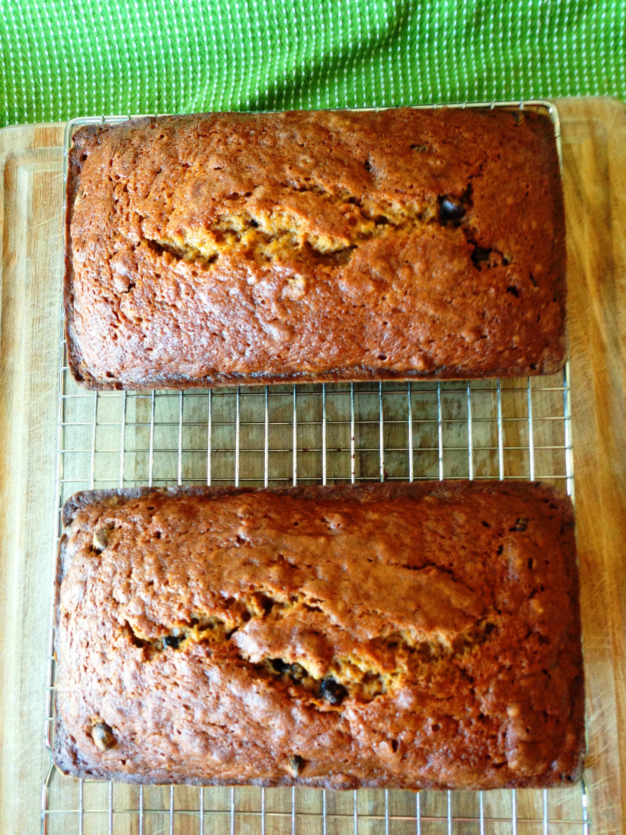 Pour the batter into the two pans. Tap on a counter to even out. Bake for 80 minutes at 350 (rotating half way through) until a toothpick comes out clean (minus any melty chocolate on it). Cool the breads in the pans for 15 minutes then cool on a wire rack completely.