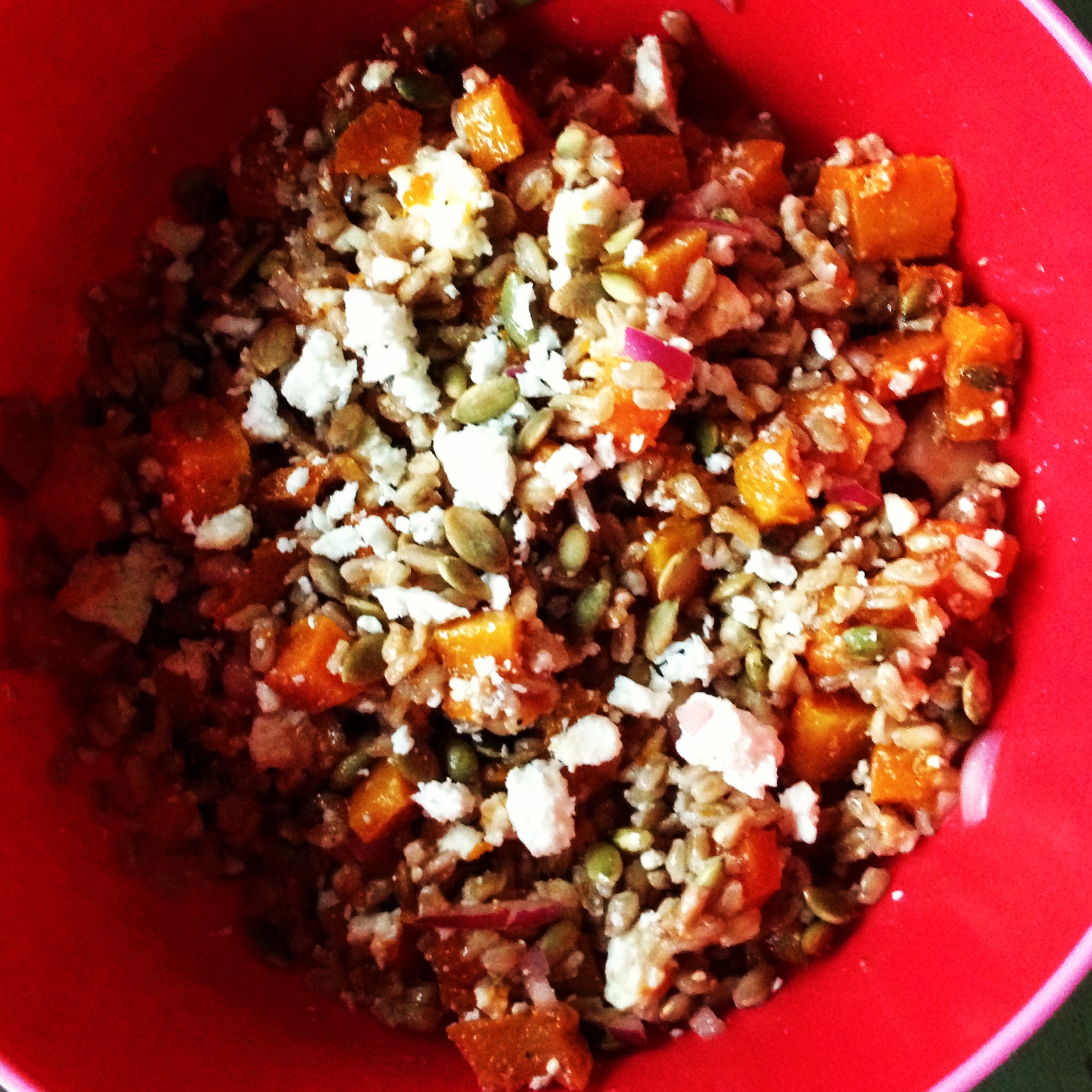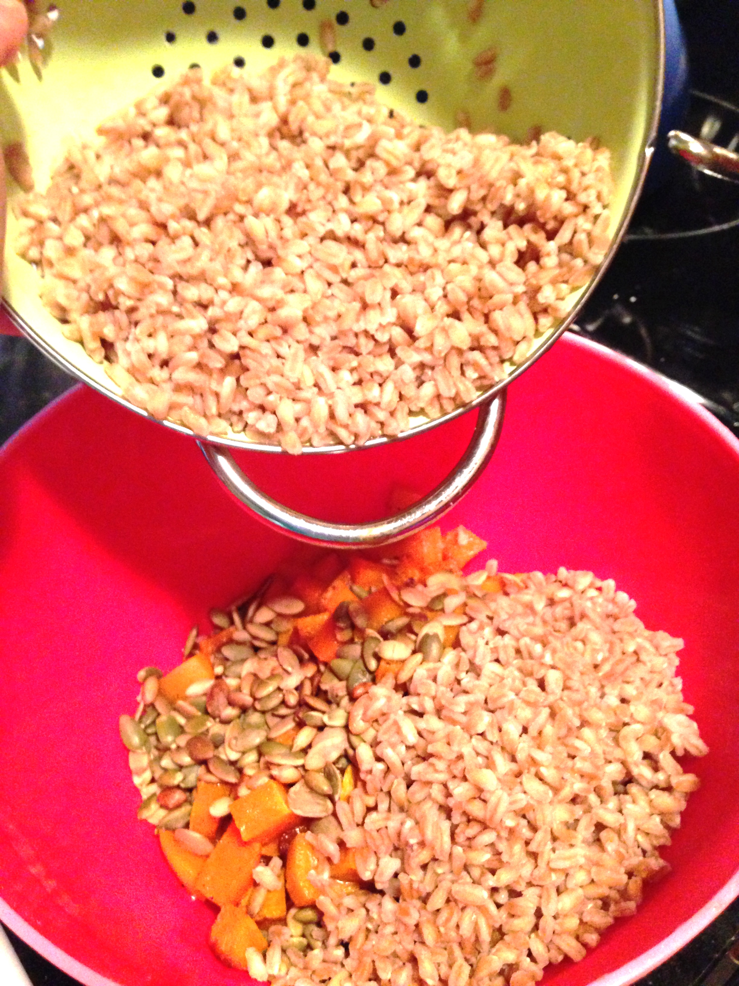 In a large bowl mix squash, farro, red onion and its liquid mixture, the crumbled feta and pumpkin seeds. Add 3-4 tablespoons of remaining olive oil. Salt and pep to taste. Will taste better as time goes on throughout the week.