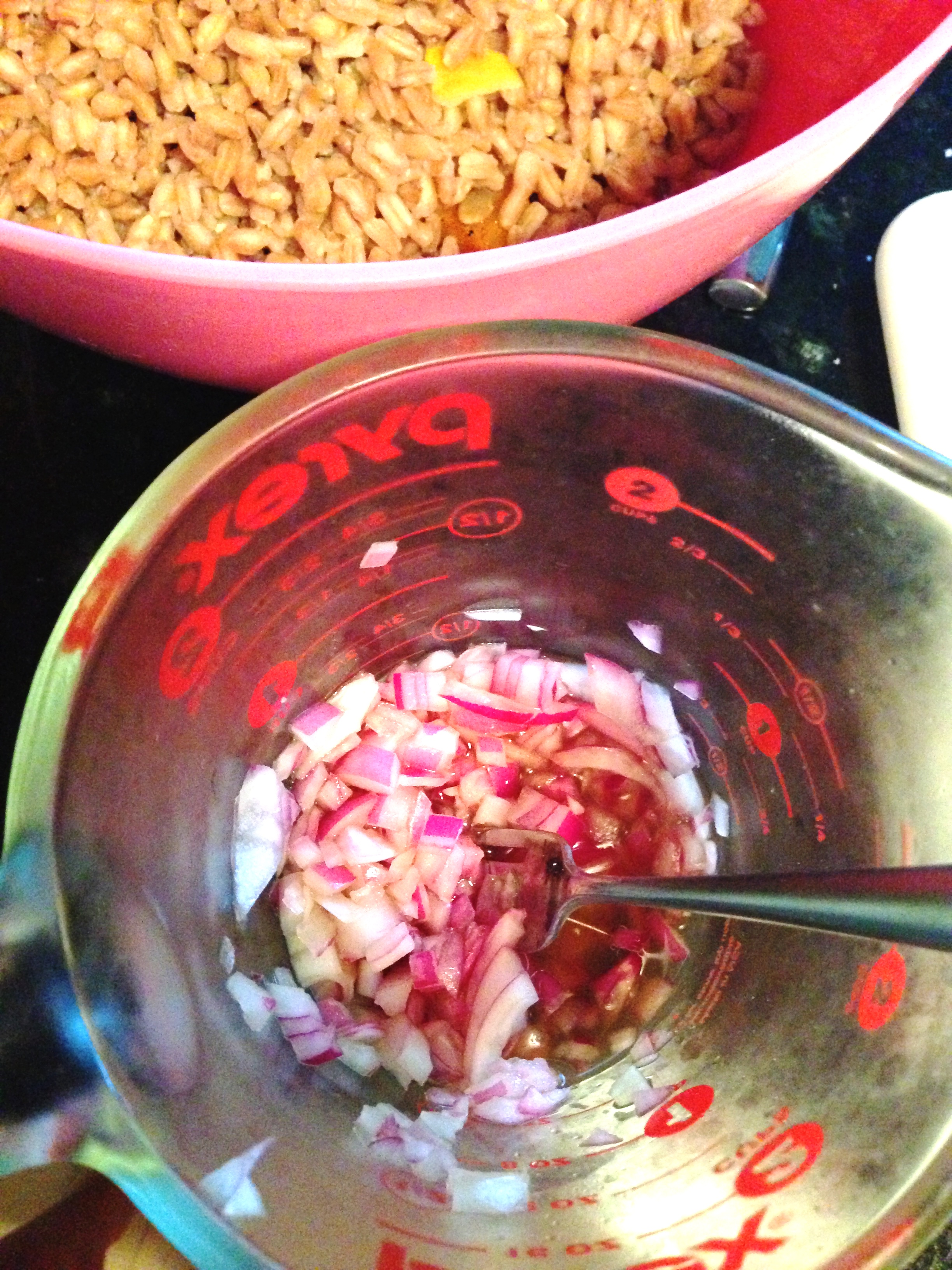 Cook farro in a pot of simmering salted water until the grains are tender (30ish minute). Drain and cool slightly.