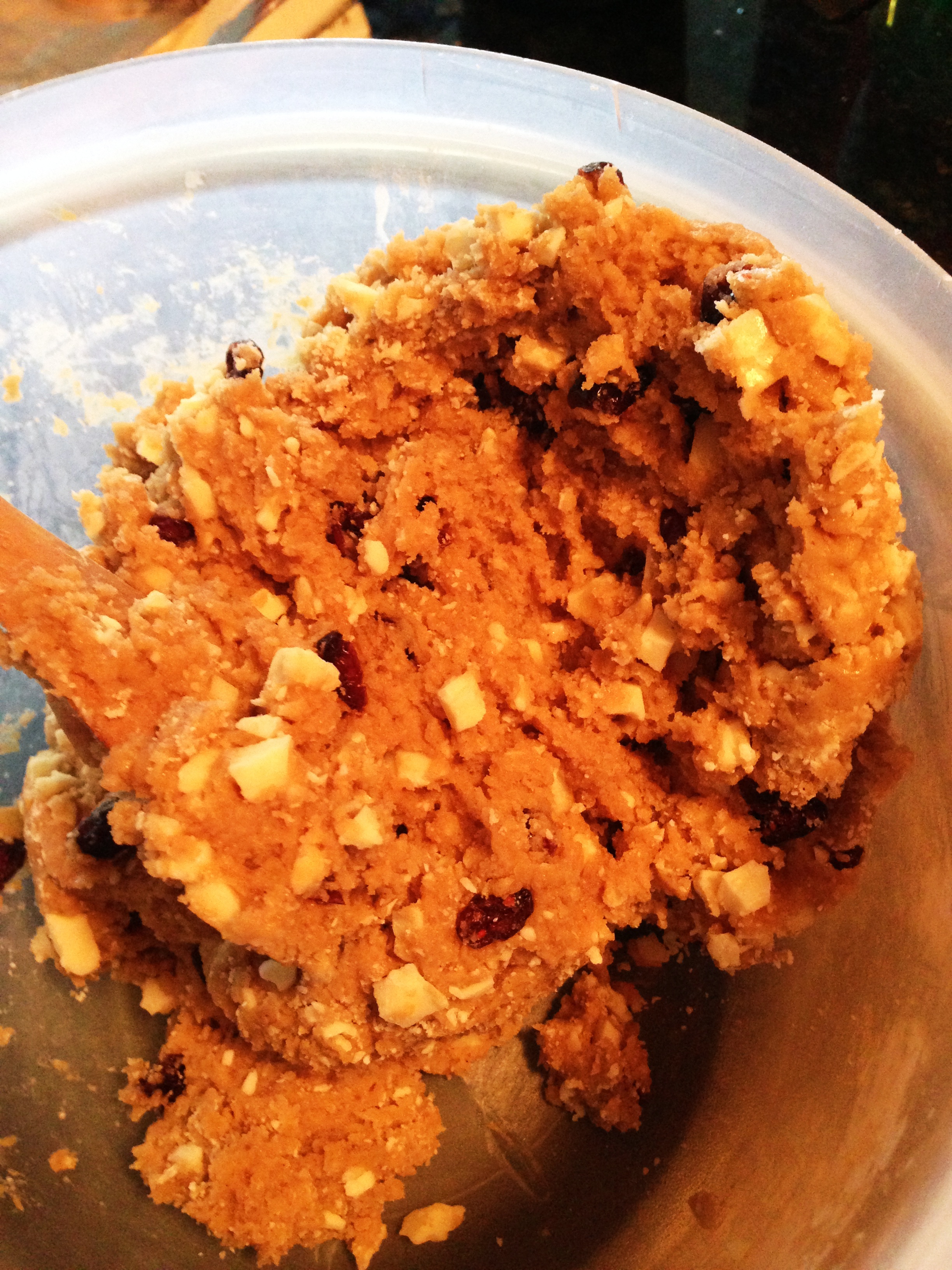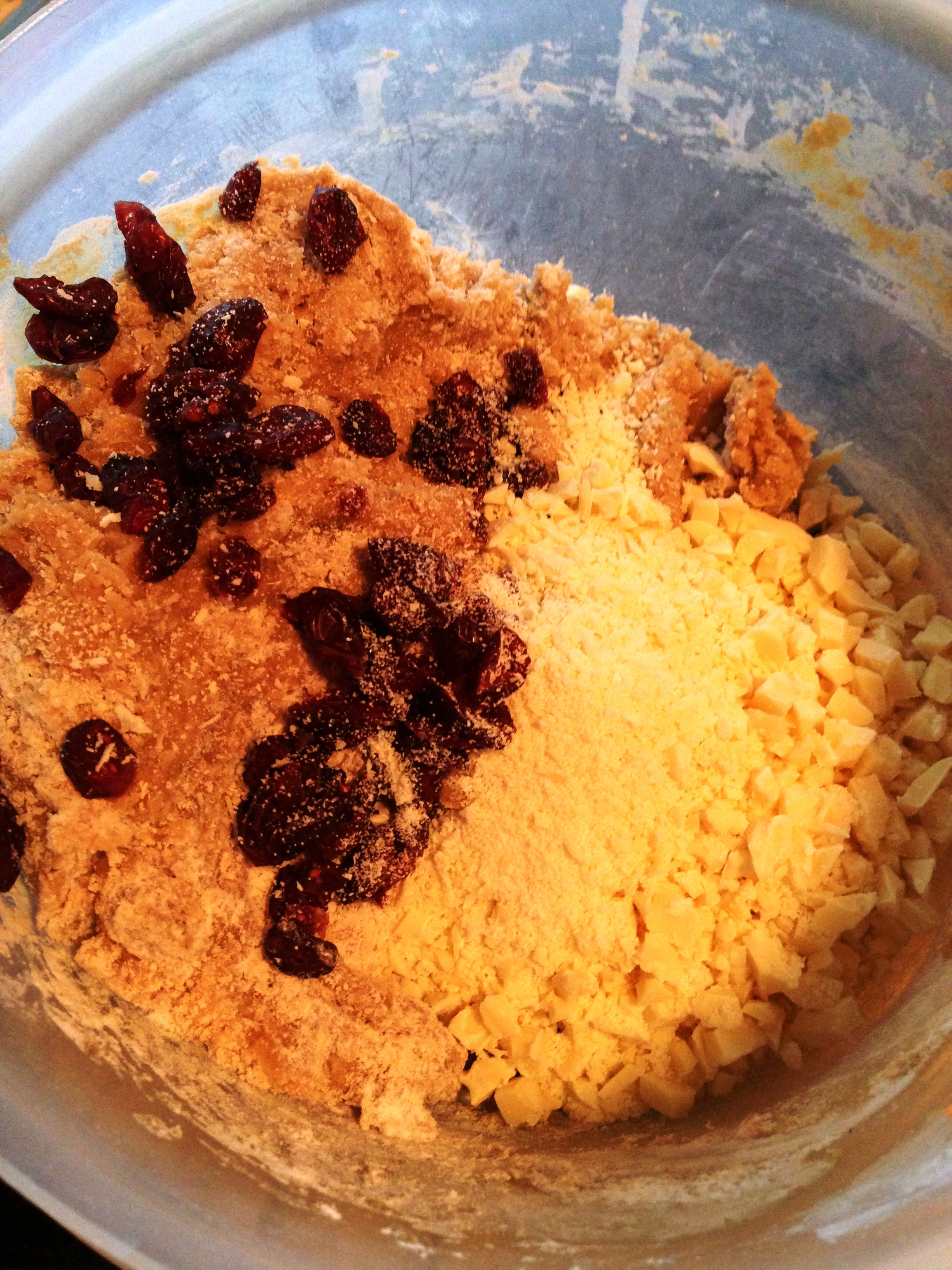 Beat in eggs and vanilla. In a separate bowl whisk flour, baking powder, salt and cinnamon. Add dry ingredients to wet ingredients. Stir in cranberries and white chocolate.