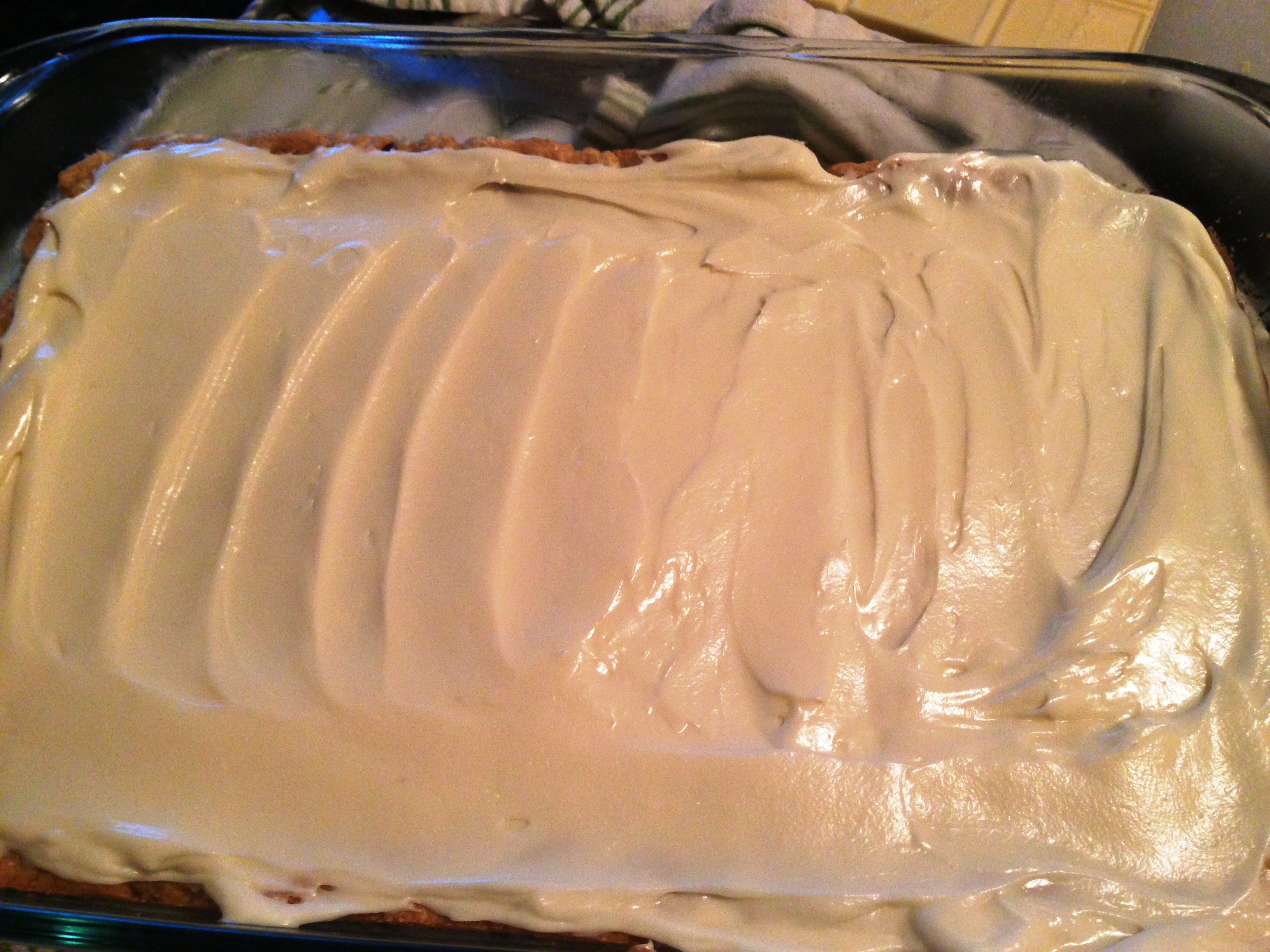 Beat cream cheese and powdered sugar. Add half of the melted white chocolate. Frost.