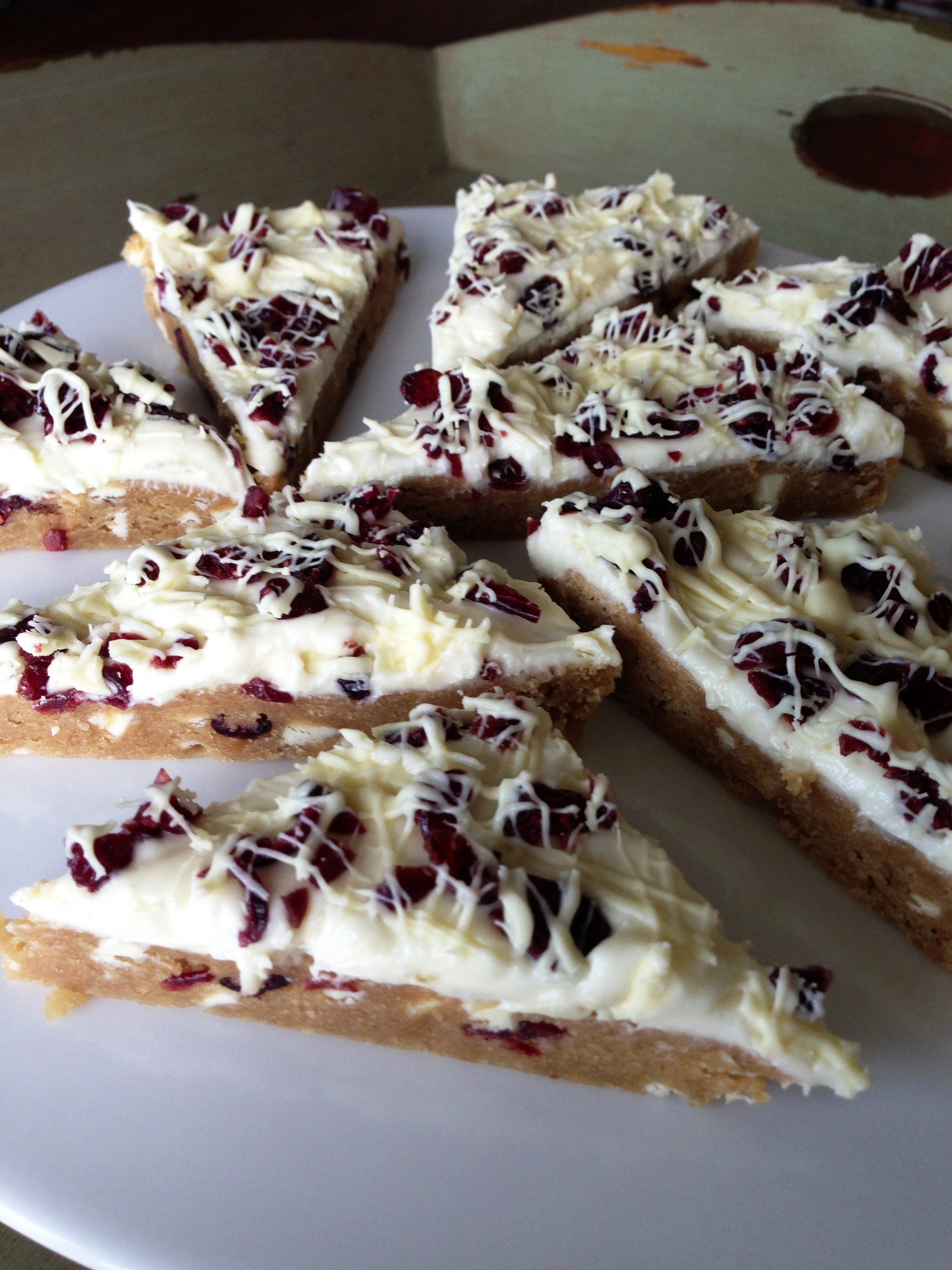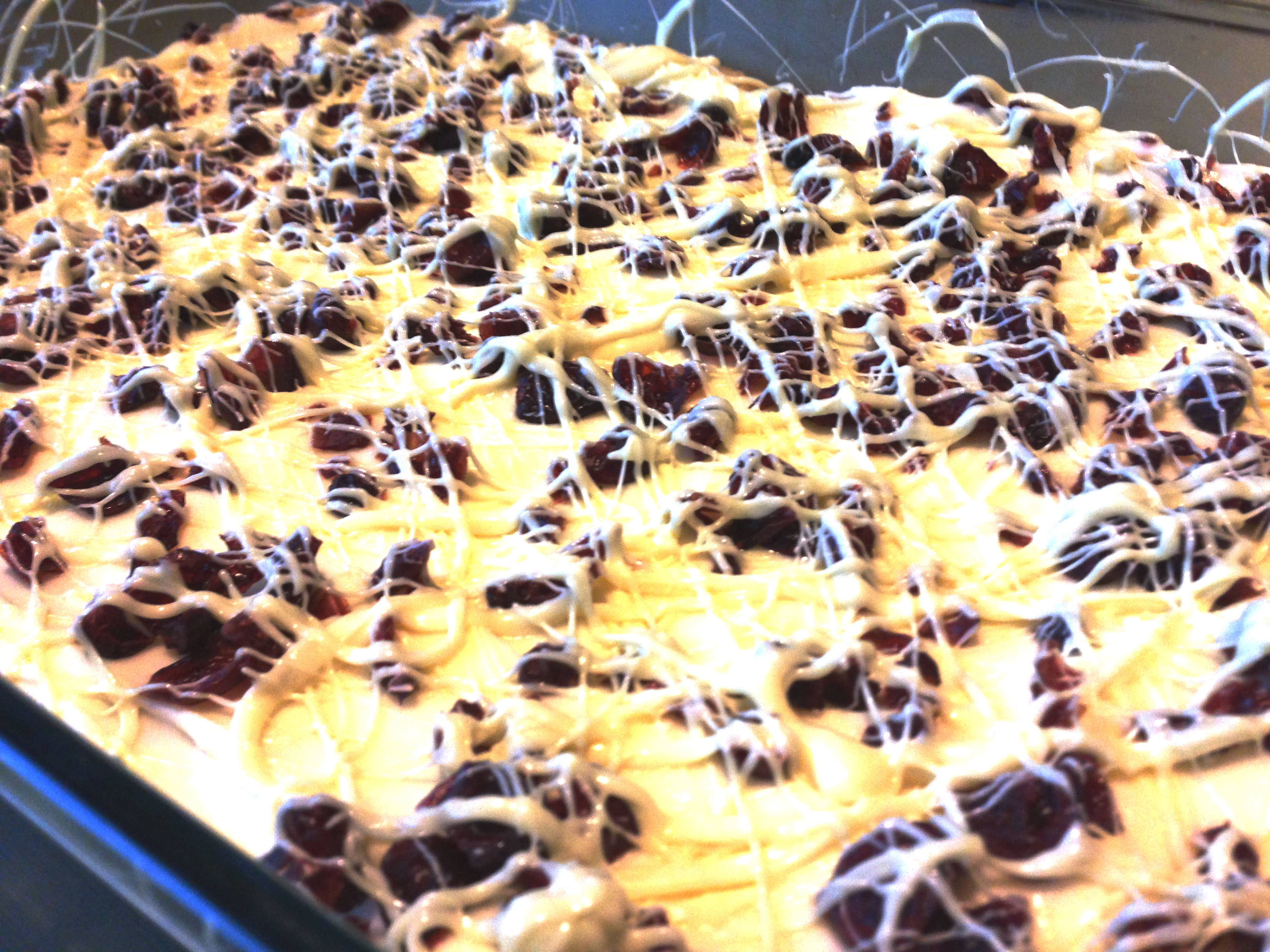 Sprinkle with cranberries. Drizzle with remaining melted white chocolate (I melted three ounces of the white chocolate, used that in the frosting, frosted and topped with cranberries then melted the remaining white chocolate to drizzle over). Refrigerate.