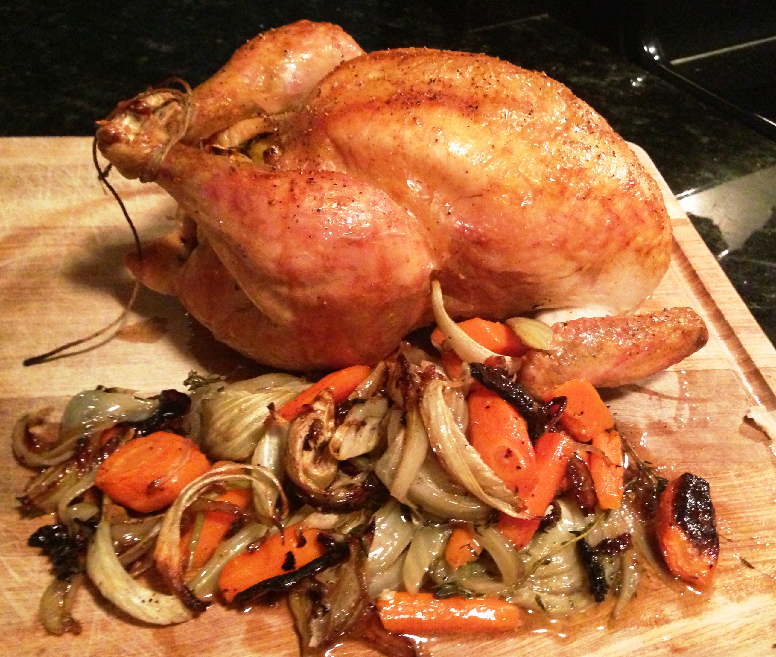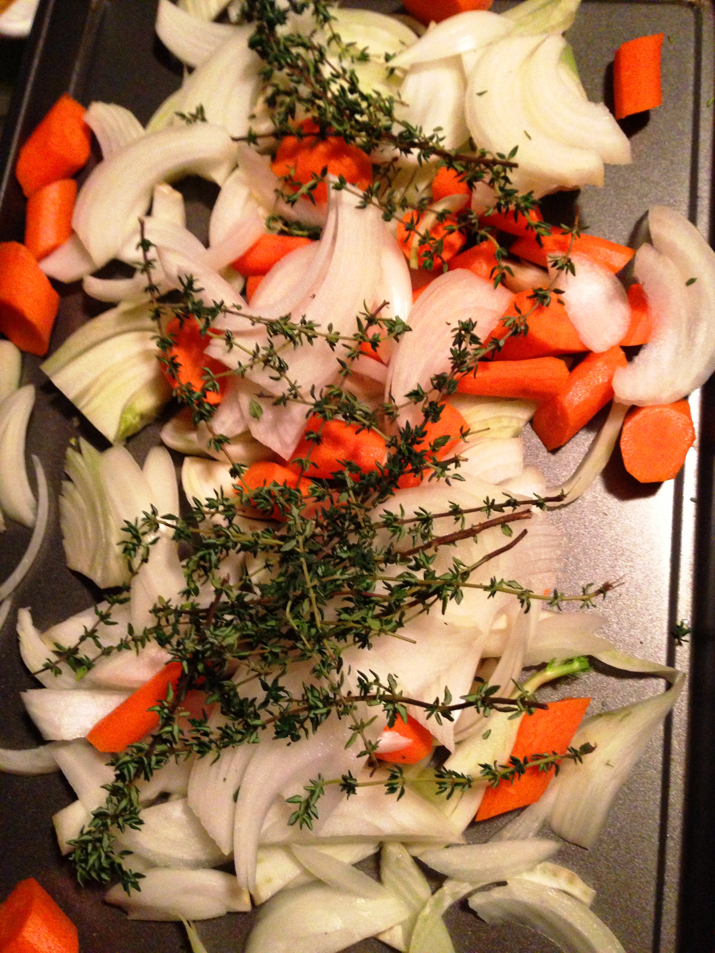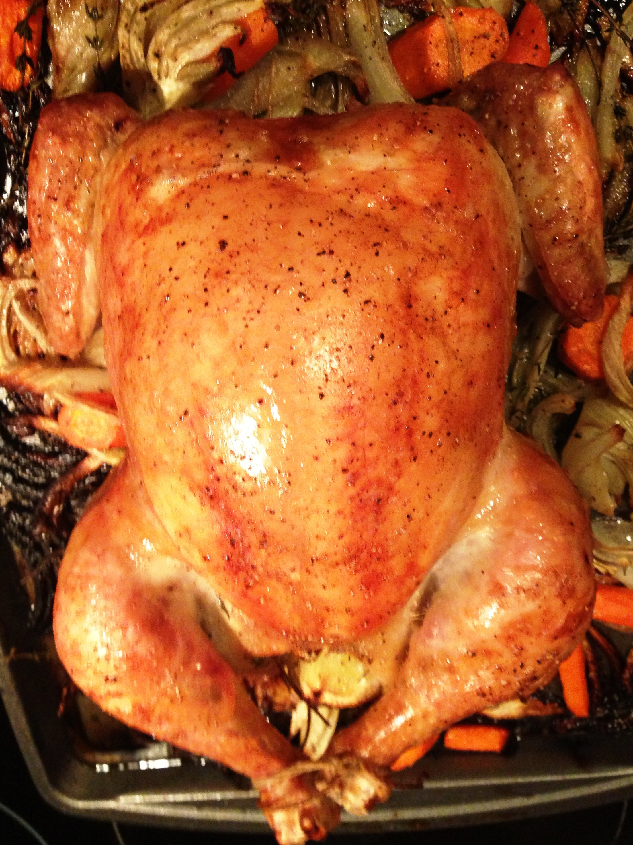 Place the onions, carrots and fennel in a roasting pan or whatever dish/sheet you have for your bird that won’t get chicken jus all over your oven. Toss veggies with salt/pep/20 sprigs of thyme/olive oil. Spread around bottom of pan and place chicken on top.