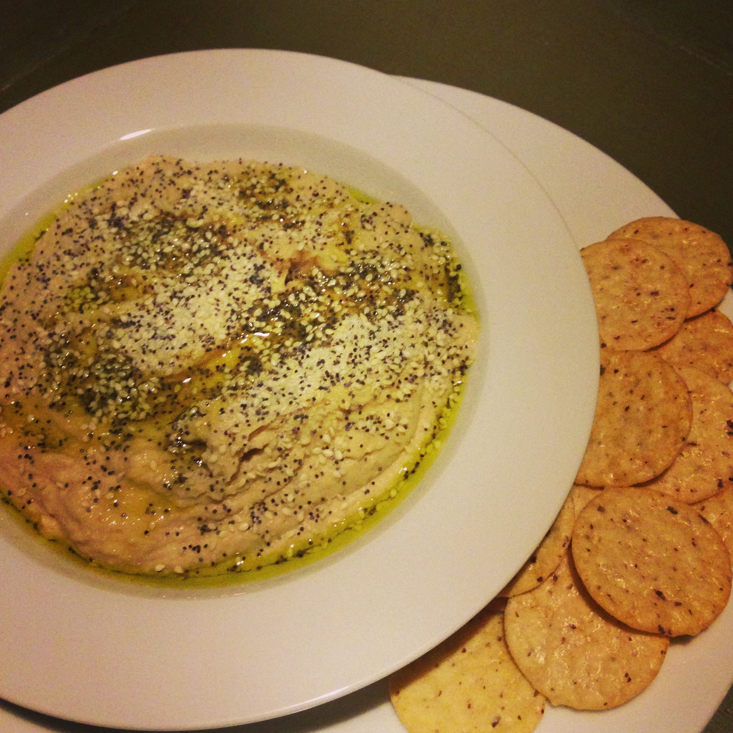 Add garlic and beans to food processor and pulse until a puree forms, roughly 3 minutes.  With the processor on low, drizzle in olive oil and sesame oil. Continue blending for a few minutes, scraping down sides if needed, until the mixture looks hummus-consistency enough for you.  Add salt but don’t forget the everything seasonings are aggressive so don’t over-salt.