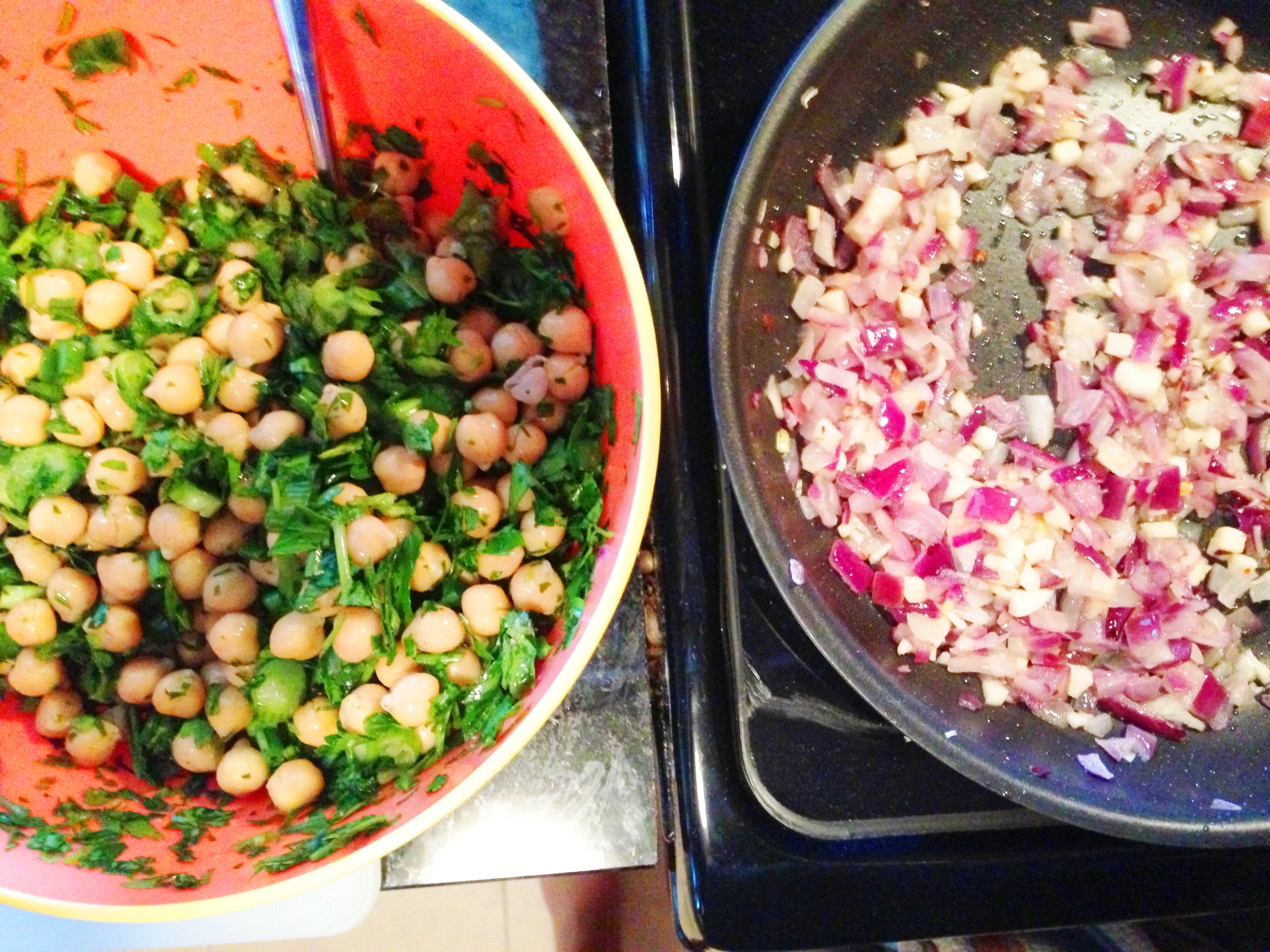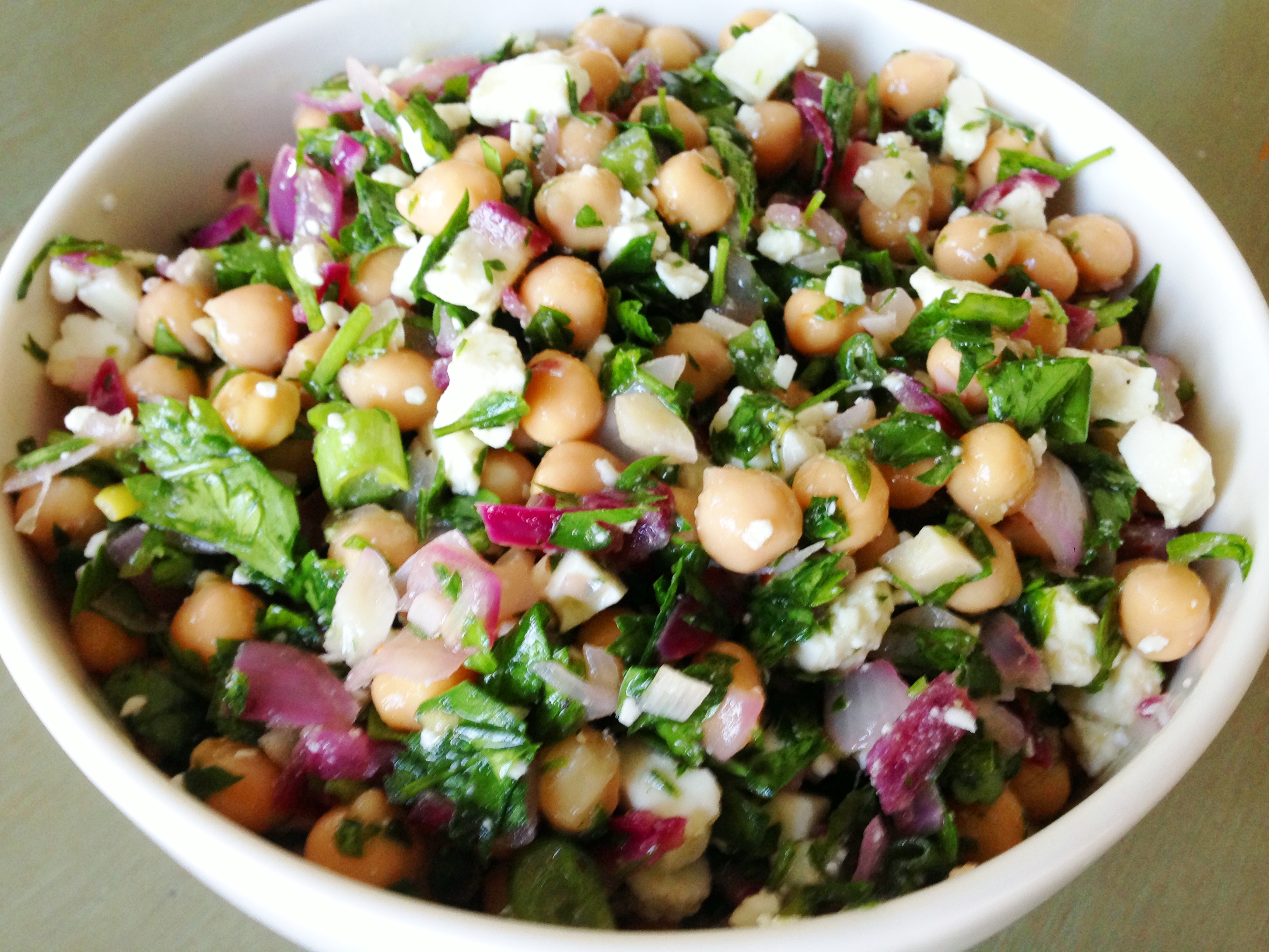 Drain the chickpeas, rinse and place in bowl. Add feta, scallions, parsley, lemon juice and salt and pepper. Add the onion and garlic mixture and remaining oil.