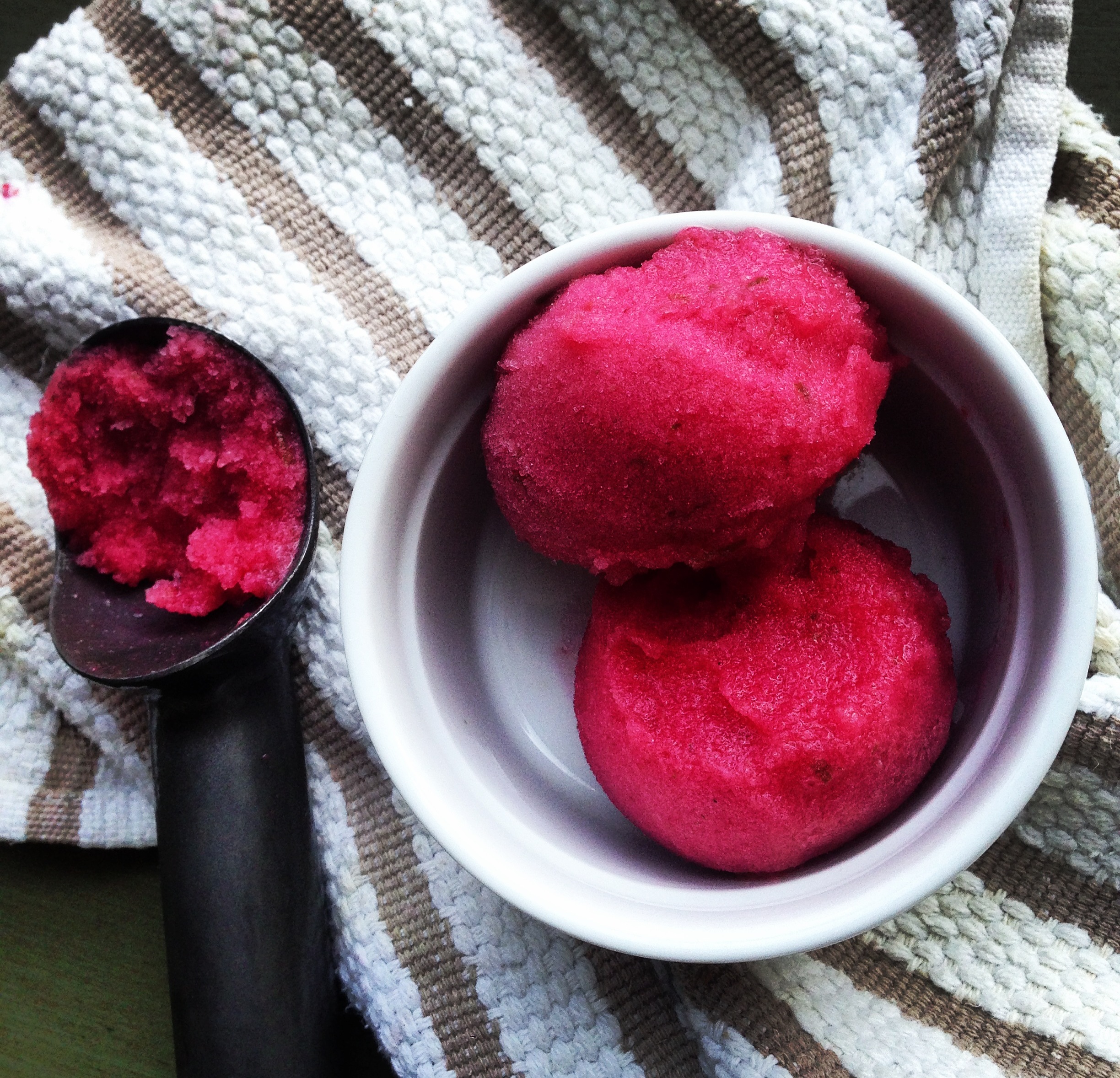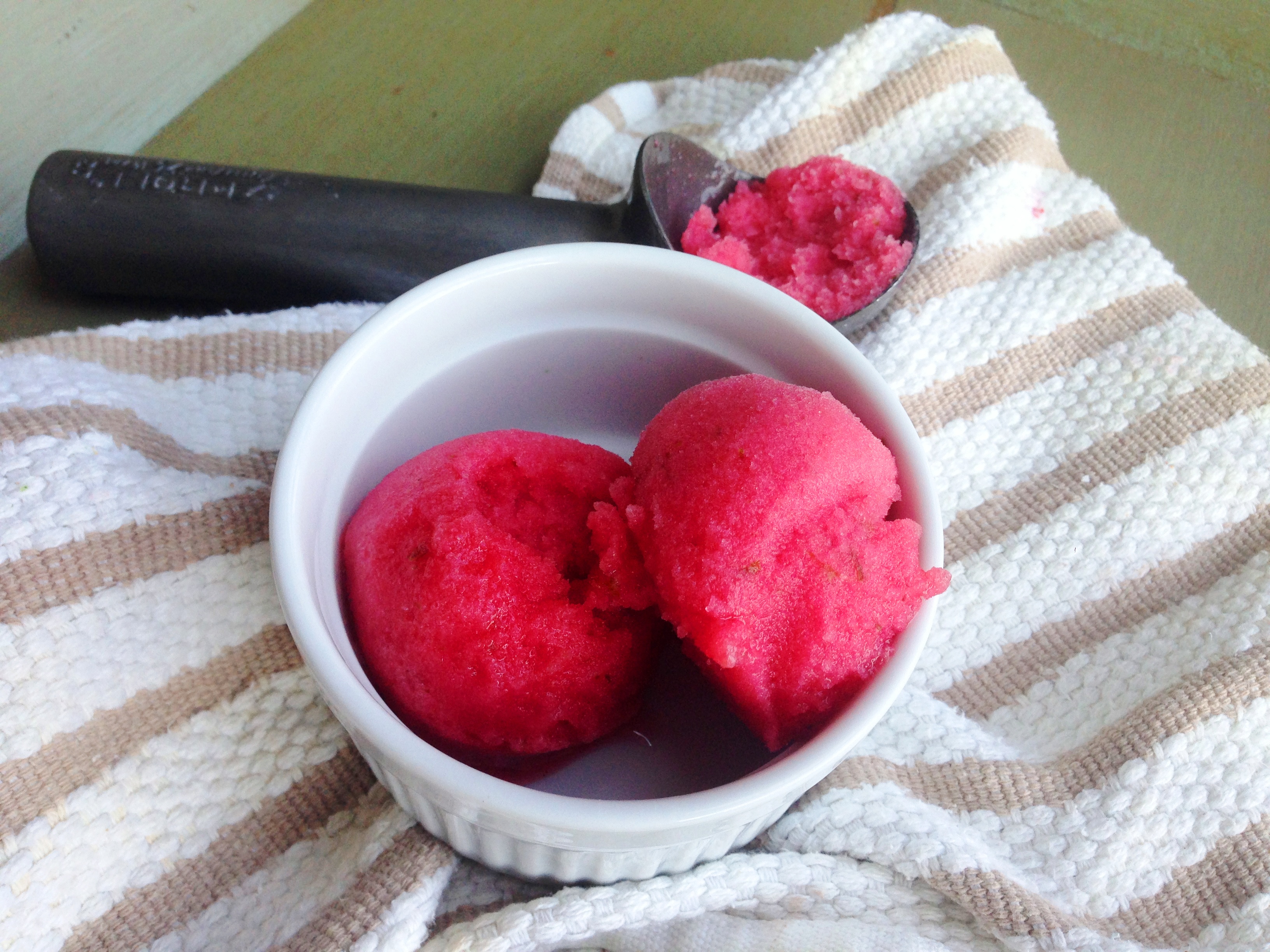 Freeze in ice cream maker according to manufacturer’s instructions. Transfer to a container and place in freezer until it hardens (at least an hour). Turns out this is crazy easy…much easier than making ice cream. A lot of sorbet in my future.