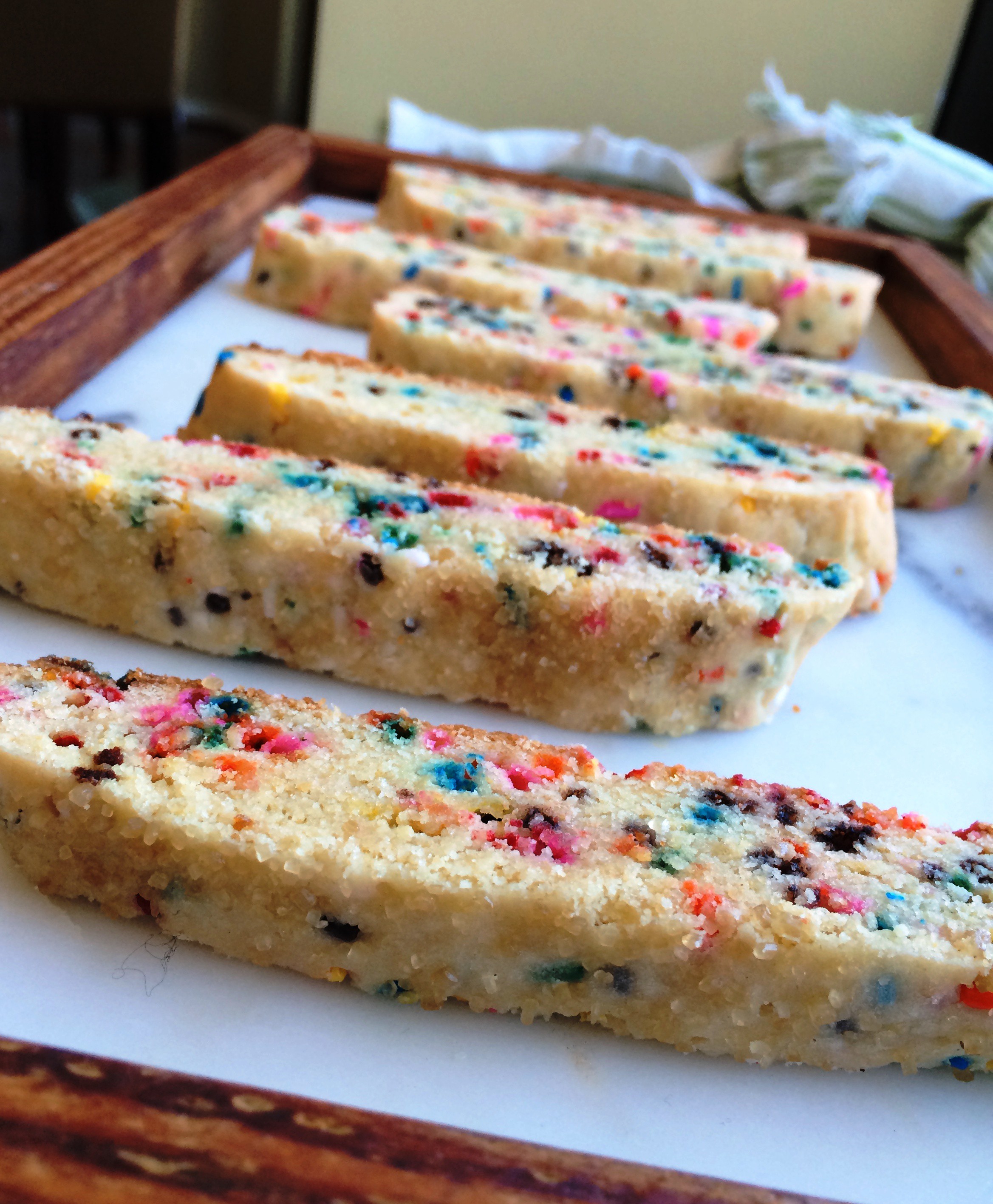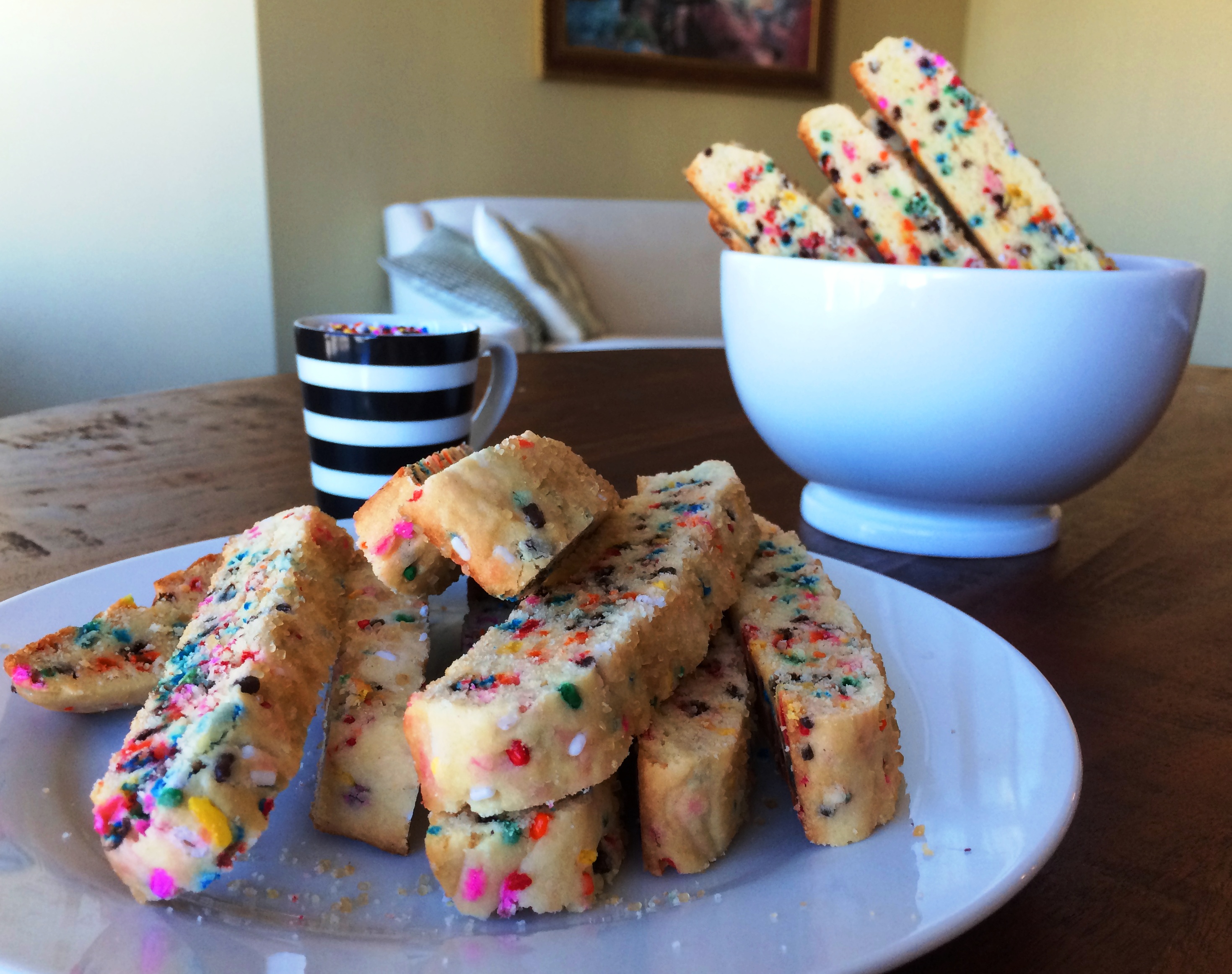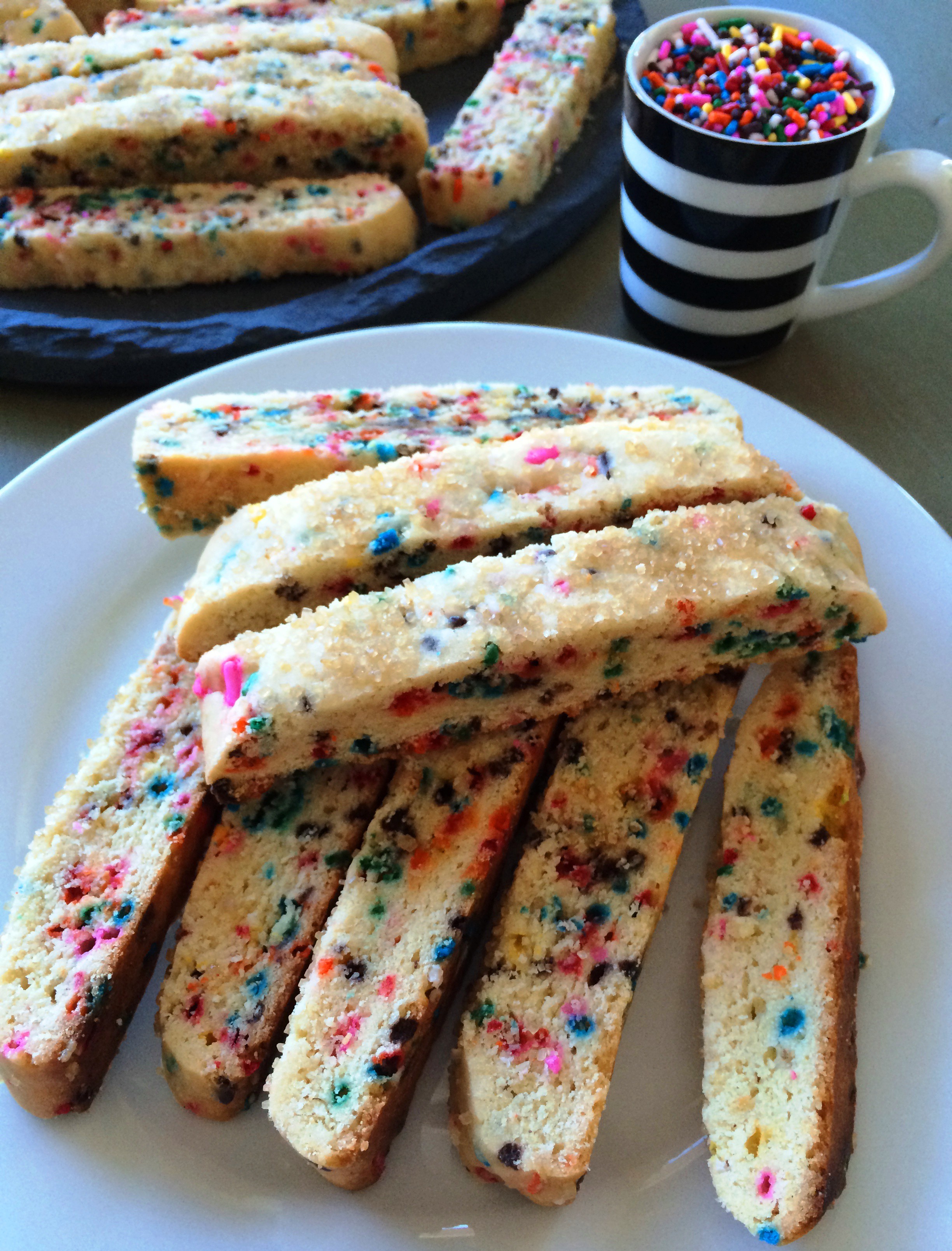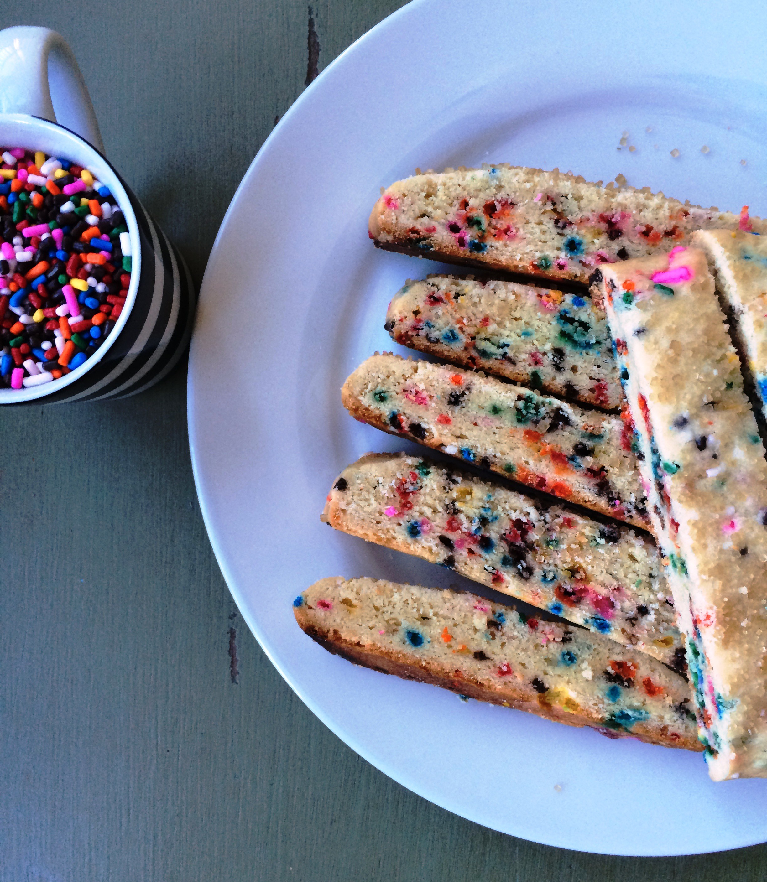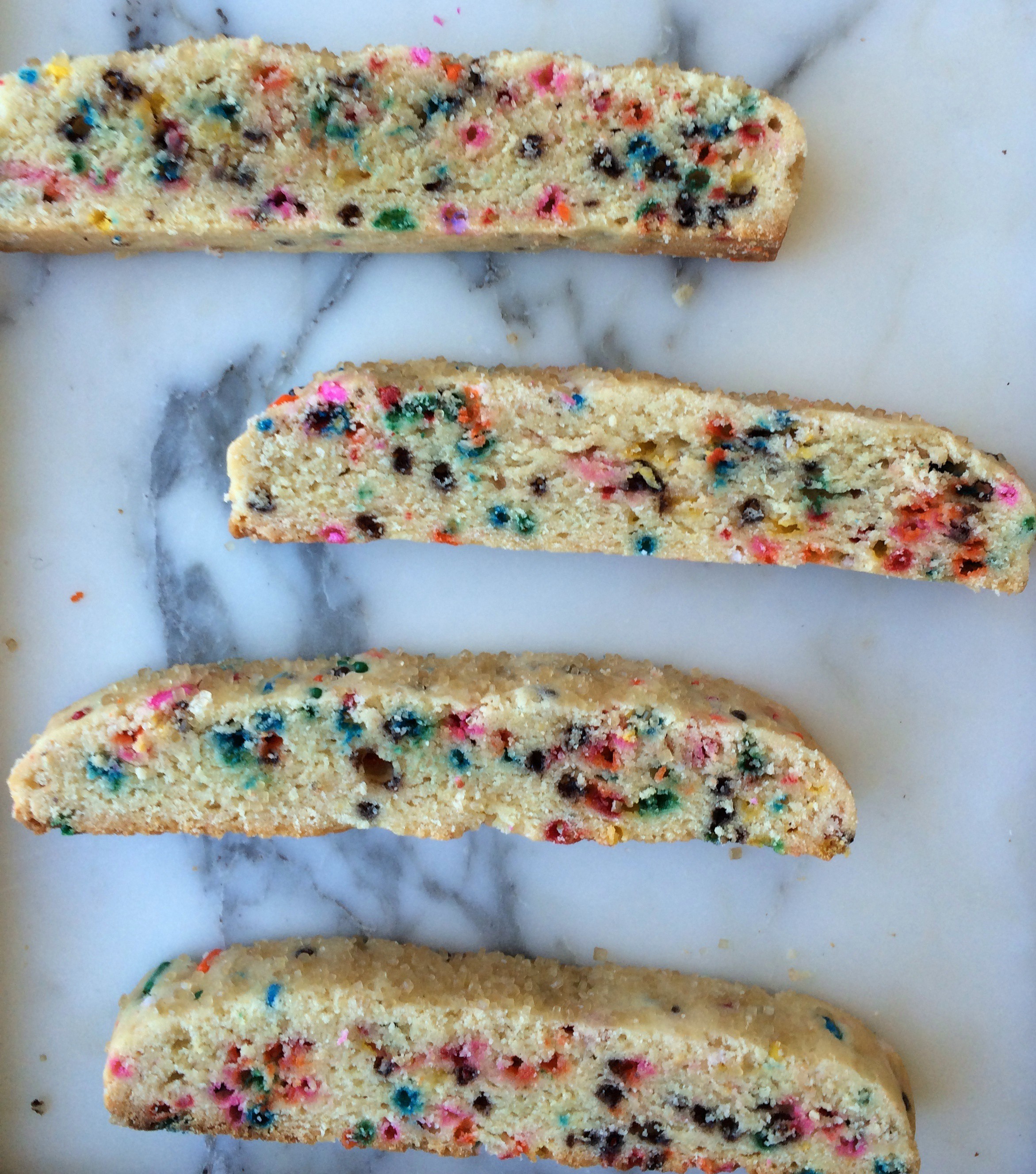 I’m a little embarrassed about these biscotti. I mean funfetti has never been my jam. I’m not eleven. I’m not really into flavorless, dye-filled, sprinkles that bring nothing to the party in terms of taste. But… they’re so cute. I mean the cutest. And they are addicting to eat. And they are kind of a mature, funfetti format right? Biscotti. Grown-up funfetti snack.