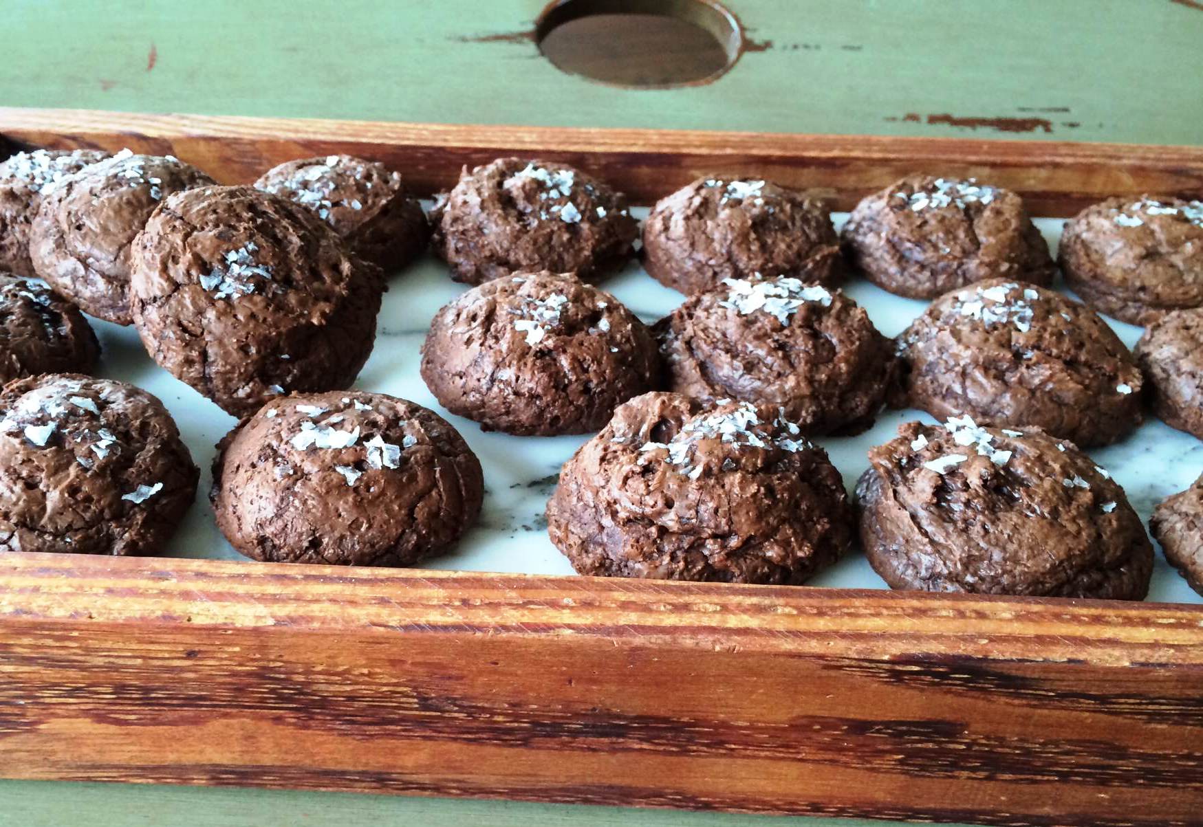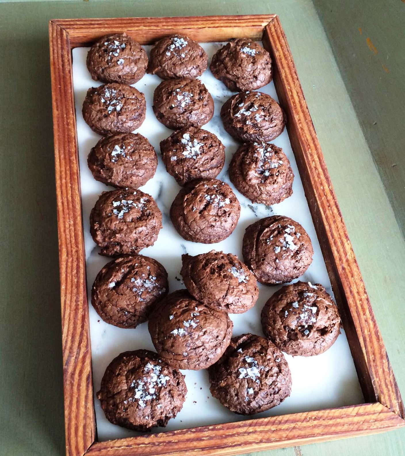 Remove the dough from the fridge and scoop with an ice cream scoop onto parchment lined baking sheets.  The dough will be soft which is normal.  Top each mound with a few flakes of sea salt, pressing gently to adhere.