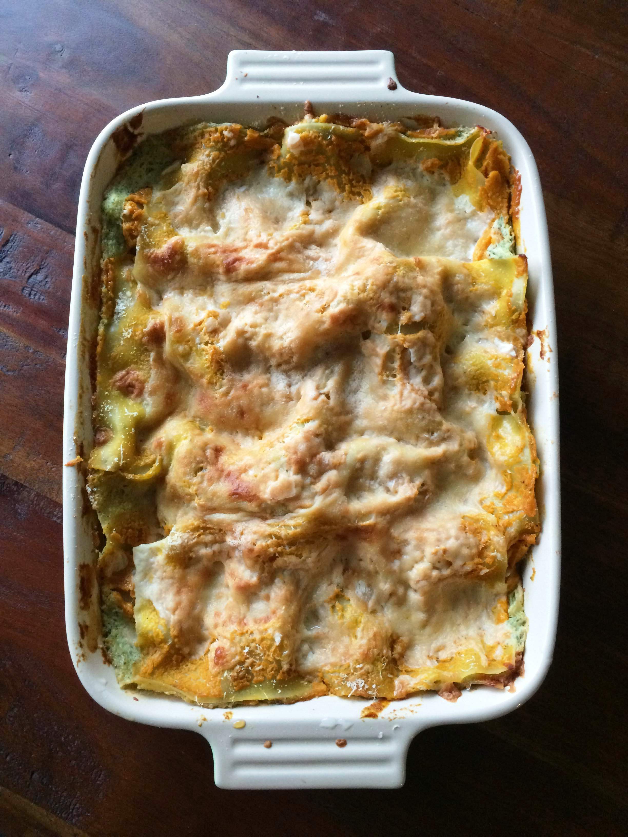 Lightly butter a 13 by 9 by 2-inch glass baking dish. Spread 3/4 cup of the sauce over the prepared baking dish. Arrange 3 lasagna noodles on the bottom of the pan (feel free to break noodles or whatever you have to do to make it fit… rustic is fine). Spread 1/3 of the squash puree over the noodles. Sprinkle with 0.5 (or slightly more) cup of mozzarella cheese. Drizzle 0.5 cup of sauce over the noodles. Repeat layering 3 more times. Basically just layer up all your ingredients however you see fit.