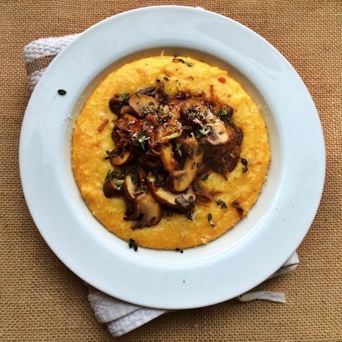 The farmers market is now open outside in all its glory. I am beyond ready to embrace warm weather and all the food choices that come with that. Unfortunately, it was cold and rainy all weekend ultimately leading to comfort food craving. Enter: parmesan polenta with lemon thyme mushrooms. Gorgeous mushrooms from the farmers market sautéed with shallot, garlic, thyme and lemon on top a bed of creamy, cheesy polenta. Yes please. A little side of farmers market greens and this was one comforting, vegetarian, gluten-free meal. Sidebar- this polenta is pretty full proof and would be great with a number of hats including shrimp, chicken, spinach, etc.