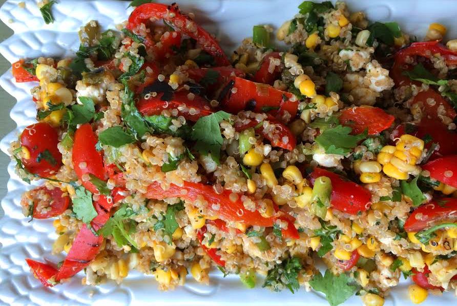 I wanted to make mac and cheese last night. I wanted to make comfort food. But it’s healthy summer salad pile time. Despite the constant rain and general gloominess that Chicago keeps hitting us with, we will not give in. We will grill corn. We will grill peppers. We will consume cilantro, jalapenos and summery goodness. That’s what this recipe is… filled with fresh produce, healthy quinoa, and grill marks… and tons of flavor.