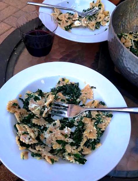 Save a half cup of the past water. Drain pasta and return to pot. Crumble goat cheese over hot past and stir until creamy. Pour pasta into sauté pan (off the heat) and toss everything together. I seasoned with black pepper but didn’t feel it needed salt. You can thin the sauce out with pasta water if necessary; I ended up adding a tablespoon to loosen it up. Serve immediately.