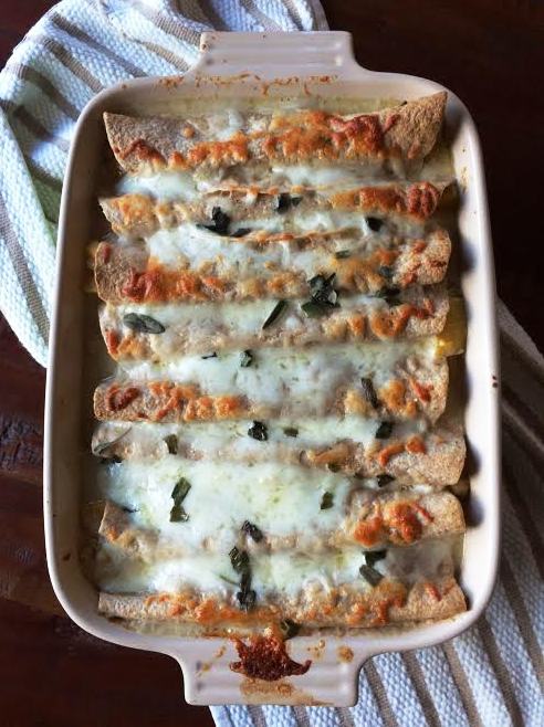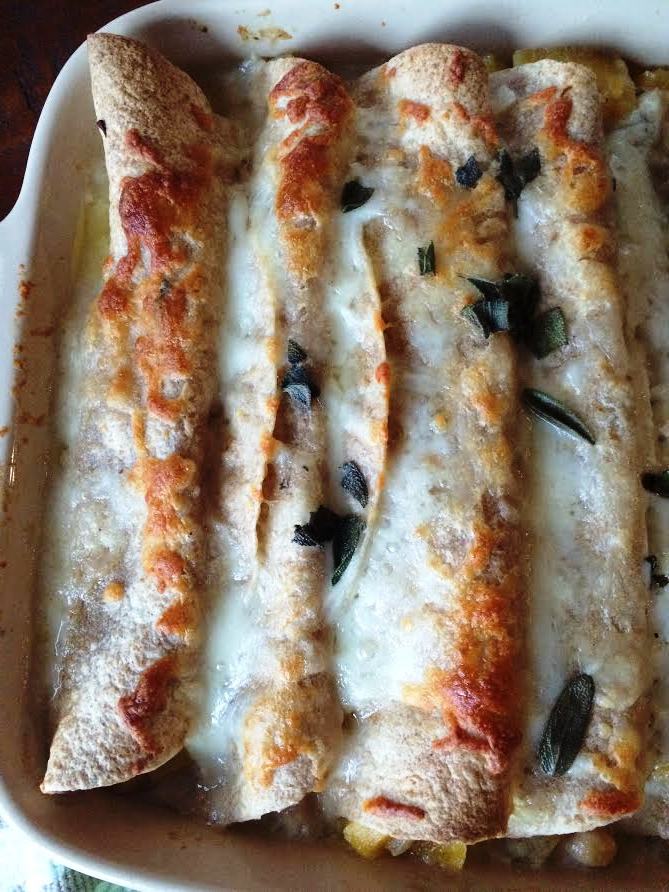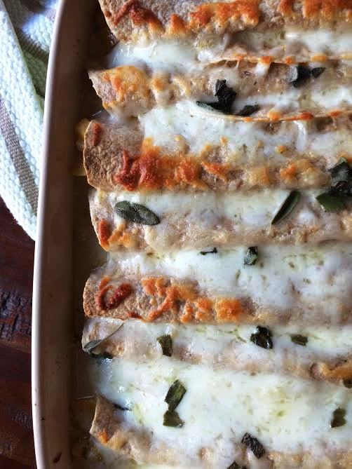 In a small skillet, raise the heat to medium-high and add butter. Once sizzling add the flour and whisk for 2-3 minutes until a golden, nutty roux forms. Pour in stock and milk, whisking again until bubbly and slightly thick. Reduce heat to low and stir in 1 cup of provolone, stirring until combined. Add in remaining nutmeg and taste to season with additional salt and pepper if desired. Pour 1 cup of sauce into the bottom of the baking dish, then spoon a few spoonfuls of the squash mixture in the center of each tortilla, rolling up tightly. I set all the tortillas out on my counter and spooned the mixture into them evenly. Then I quickly rolled them and tucked into the baking dish. Pour more of the sauce on top (can pour all of it on like I did but I wish I had poured less on). Then sprinkle with more cheese (can be all the cheese left if you’re aggressive like me)and extra sage. Bake for 20-25 minutes.