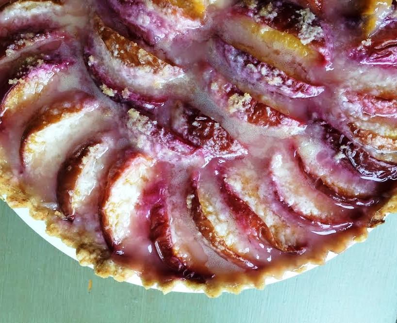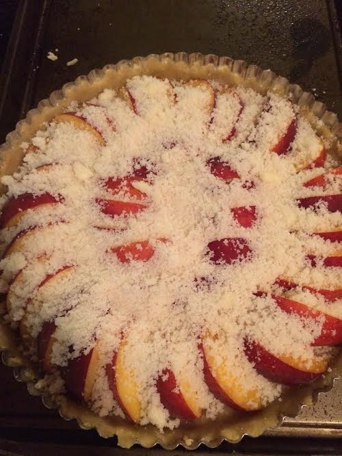 Heat the oven to 425 degrees. In a mixing bowl, stir together 1.5 cups flour, 0.5 salt and 1 teaspoon sugar. In a small bowl, whisk together the oils, milk and almond extract. Pour this mixture into the flour mixture and mix gently with a fork, just enough to dampen; do not over work it. Transfer dough to a tart pan and use your hands to pat out the dough so it covers the bottom of the pan, pushing it up the sides to meet the edge. It should be about 1/ 8-inch thick all around.