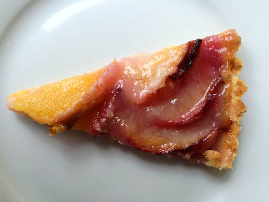 This tart is pretty epic. The crust is dead easy. Instead of a panic attack to work in cold butter before it starts to melt into the batter you leisurely work in some olive oil… by hand. No food processor required. Once the dough is done and formed into the tart pan you spread the raw peaches over the top. You don’t have to do anything to them, just tuck them into the tart. Amazing. Top with a sugar/butter mixture you mushed with your hands for a few seconds and the tart is done. The crust has a little salty kick, the peaches are delicious and there’s the lingering almond flavor. Plus it’s pretty. Success.