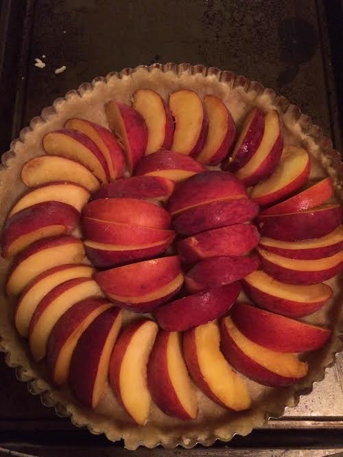 Starting on the outside, arrange the peaches overlapping in a concentric circle over the pastry, fill in the center however you can make it work. The peaches should fit snugly.