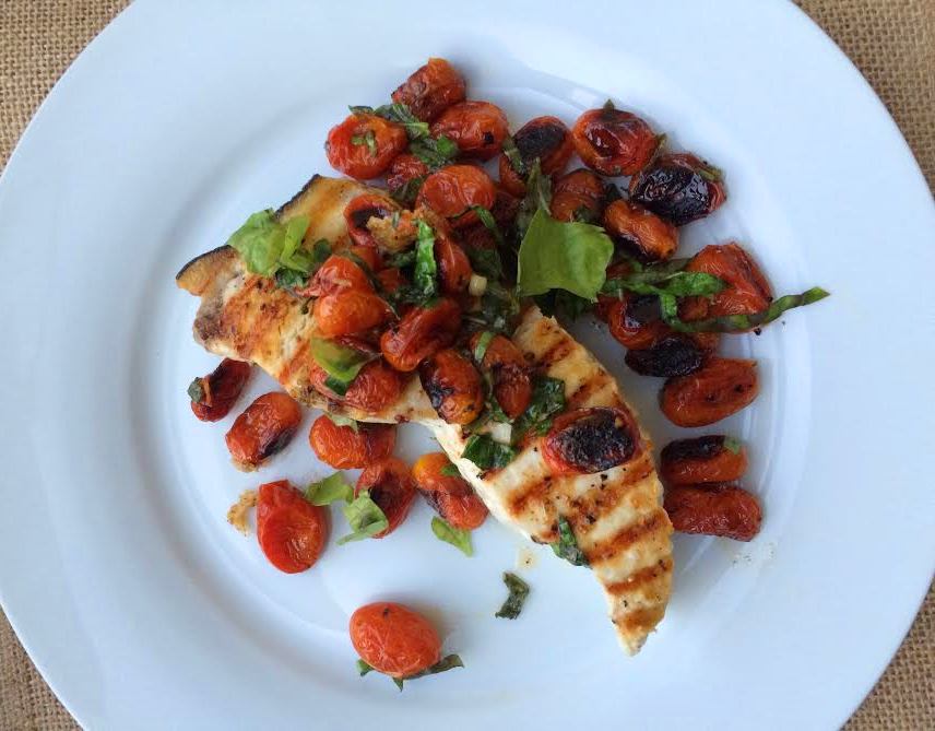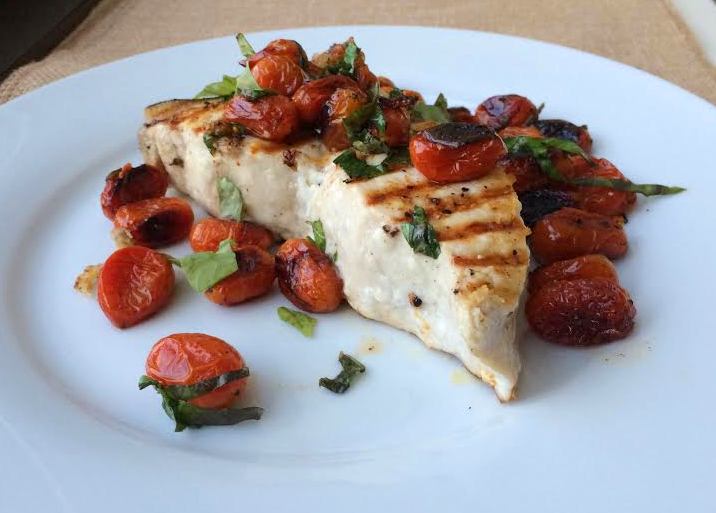While this tomato goodness is happening, season each side of the fish with salt and pep. Brush with olive oil. Add to the greased grill and do NOT touch for five minutes. Then flip and cook another five minutes.