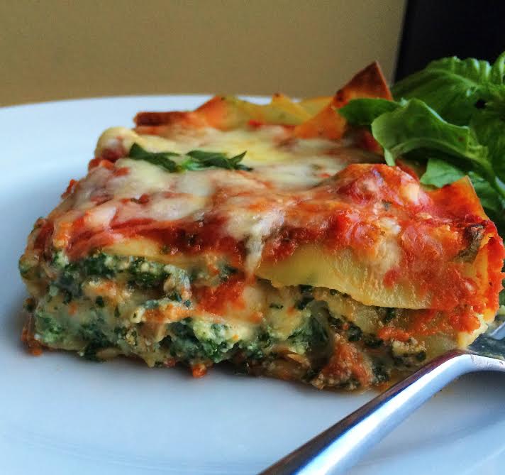 It’s no secret I like foods I can make in advance and have magically appear come dinner time. It’s also no secret that I like to take comfort food, add one or two healthy ingredients (por ejemplo spinach and artichokes) and declare the entire dish health food. This recipe combines both of these non-secrets. The result is a ridiculously yum lasagna you can throw in the oven whenever your bod needs it. Have an extra slab or two… it’s a veggie lasagna after all.
