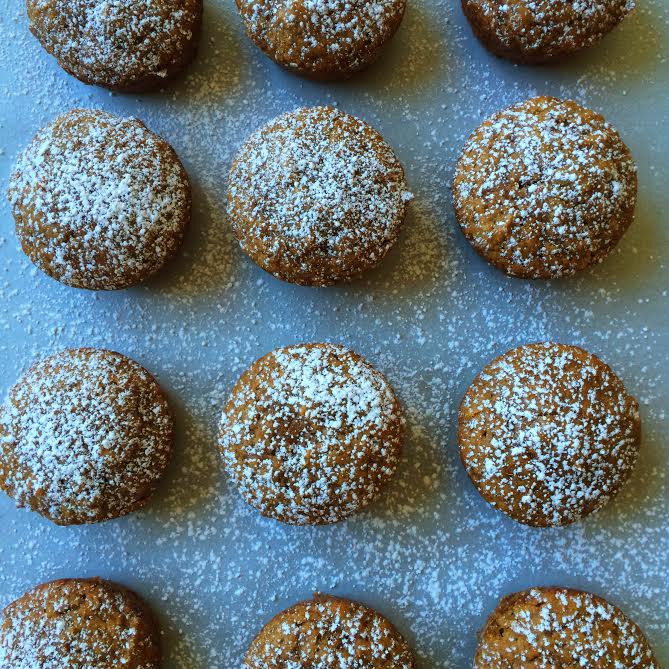 In a separate bowl sift the flour, granulated sugar, brown sugar, baking soda, cinnamon, ginger, nutmeg, allspice, cloves and salt.  Whisk to combine.  Pour wet sweet potato mixture over dry ingredients and stir gently.  Scoop (I used an ice cream scoop) batter into prepared pans.  Bake for 18 minutes.  Once cool dust with powdered sugar.