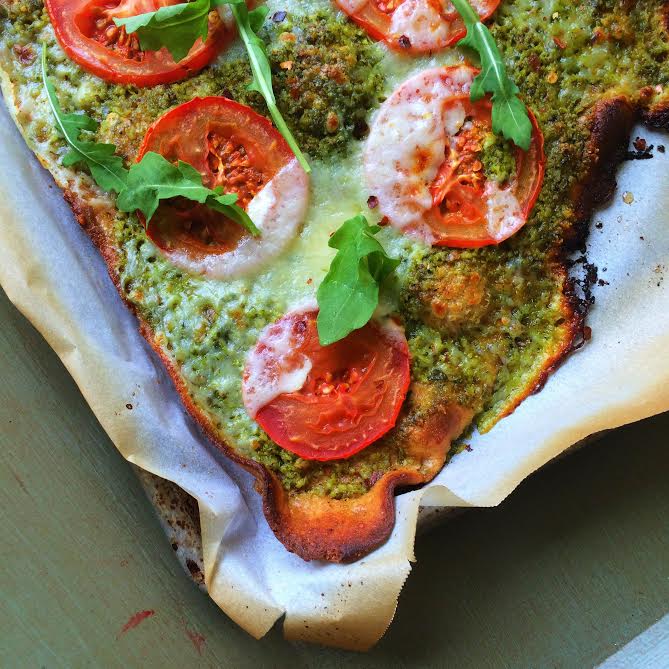 You could use arugula, spinach, basil whatever you want for the pesto. This is a greens-heavy pesto which made spread ability a bit of an issue. I justified this effort by convincing myself I was basically eating a salad.