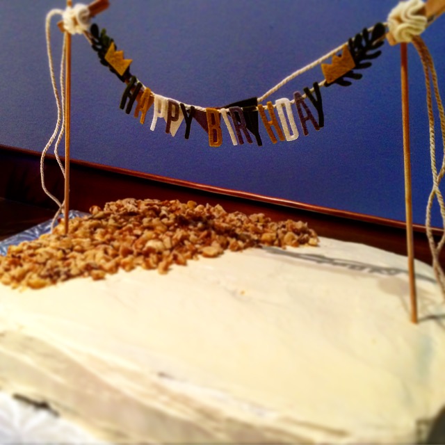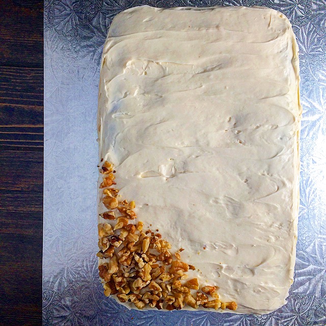 8. Spread a thin layer of frosting on the top and sides of the cake (crumb coating).  It doesn’t need to be pretty.  Let chill in the fridge for 30 minutes.  Spread the remaining frosting on the top and sides of cake.  Garnish with the remaining walnuts.  Remove the parchment paper.  You can keep in the fridge, frosted, for up to three days.