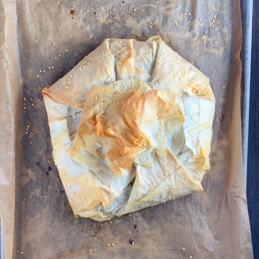 - Dump the spinach mixture in the center leaving at least a two inch edge. Now fold the edges over the center starting at one point and working your way around the pie clockwise. Crinkle up an extra one to three sheets and smoosh over the top covering the spinach mixture. Brush the whole thing with more butter and sprinkle with sesame seeds.