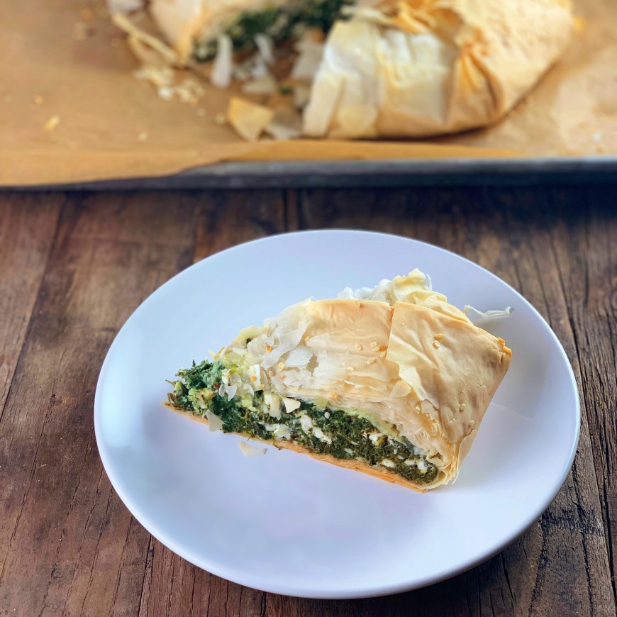 Never have I eaten so much food but still felt so light. Never could I have imagined the level of feta I consumed. My husband was not a huge feta person pre-Greece but couldn’t get enough while we were there… which is v important…. and I have spanakopita to thank. These little spinach and feta hand pies are so delicious… this version here makes one big pie which is a lot easier than individual ones and even more gorgeous.