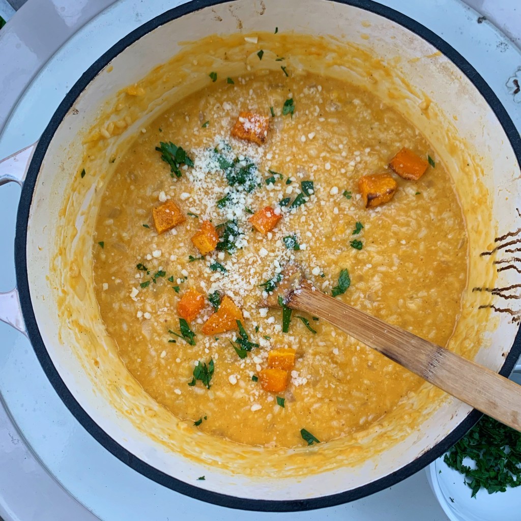 It’s that time of year for cozy bowls of Fall goodness and I couldn’t be more ready.  We’ve already taken Leila to 3 pumpkin patches/apple orchards and it’s not even October.  This Butternut Squash Risotto pairs great with your bounty from the apple orchard like my Dutch Apple Pie