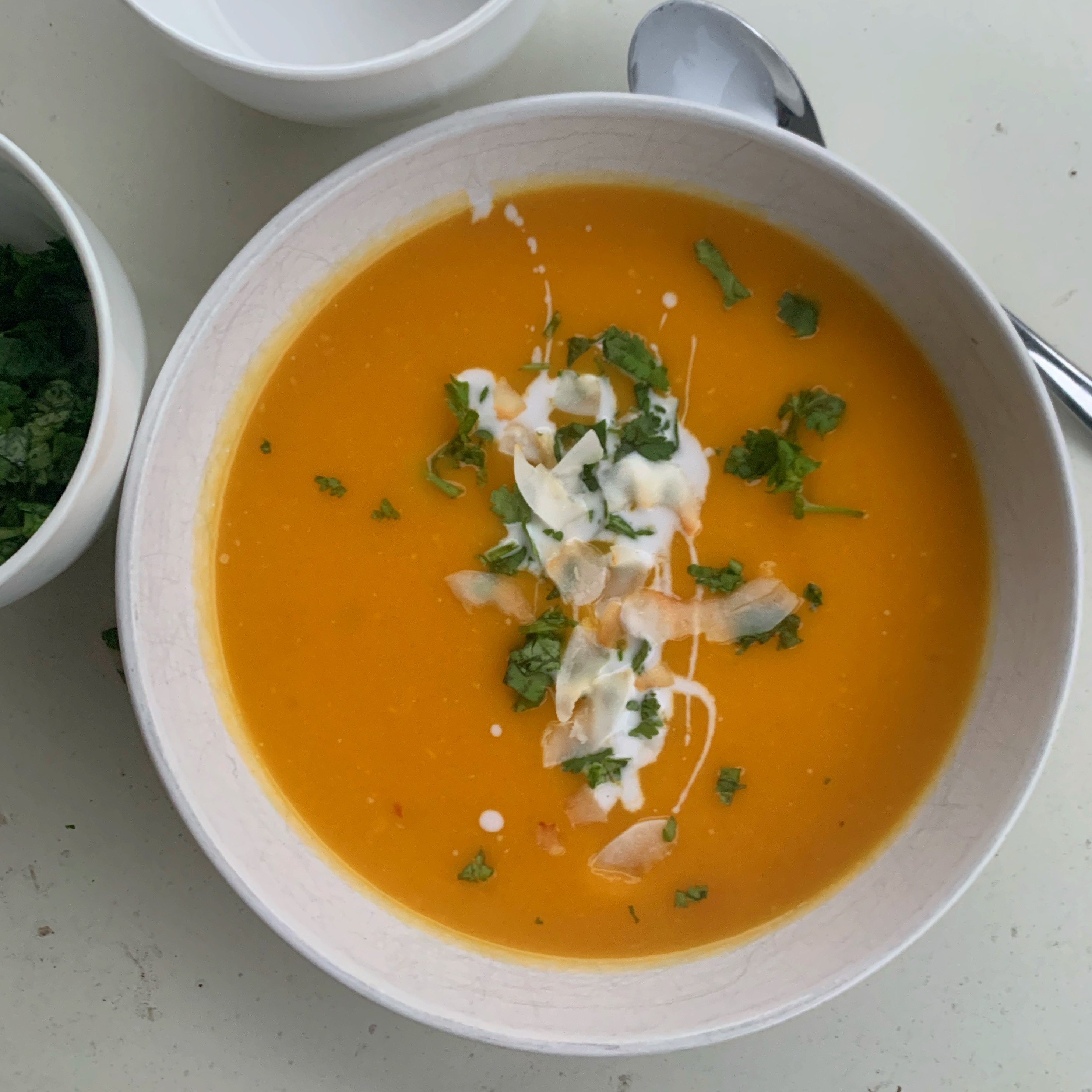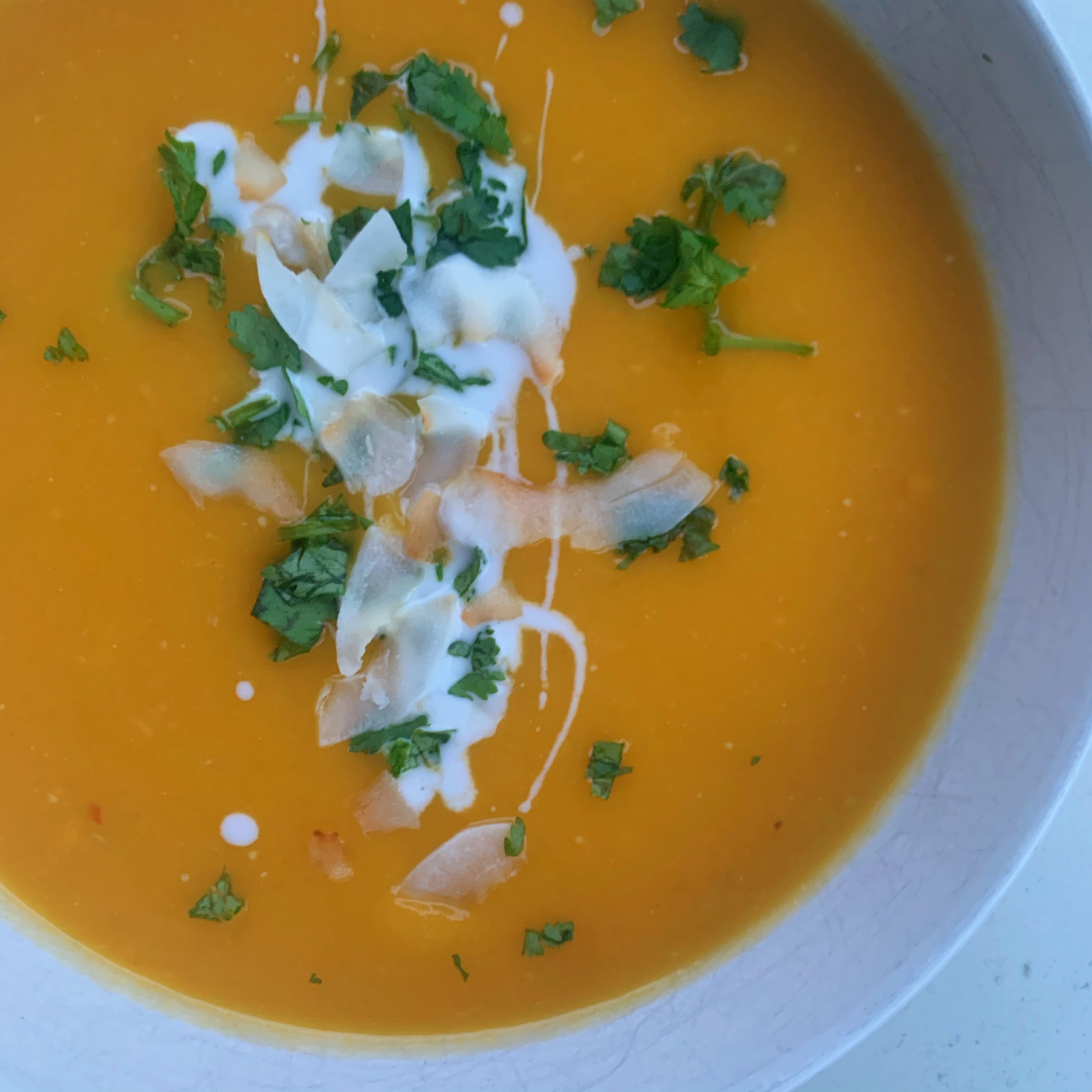The soup itself only has 6 ingredients with a few extra for garnish. The ginger really comes through in all the right ways and the creamy coconut milk mixed with the blended squash give the soup an amazing richness. The toasted coconut flakes are an awesome substitute for crackers or croutons on soup- still giving it some crunch and texture.