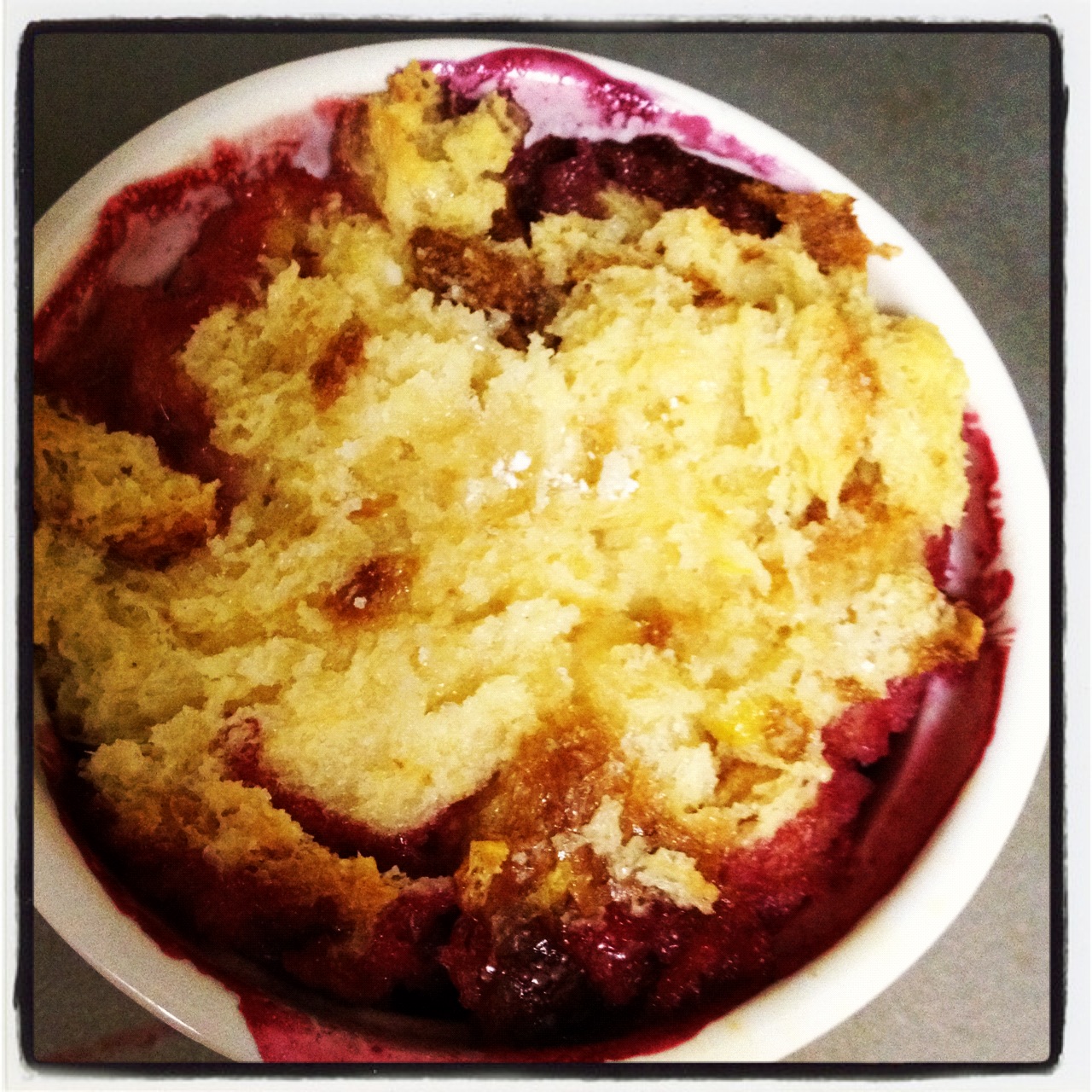 Take your DAY OLD (oh the horror) bread and soak it in a custard with some berries. You can bake this in a big dish and share, or, if you made it for one when you were chillin’ the most one day by yourself at the apartment, you can put it in an individual ramekin like I did. Enjoy.